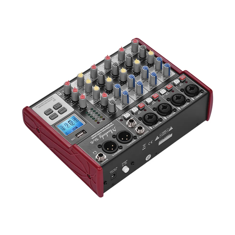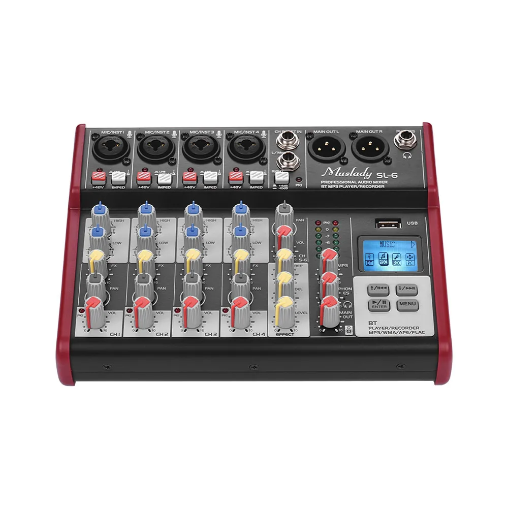 Портативный 6-ти канальный цифровой микшерный пульт с 4 * XLR Сделано в Китае/ТРС микрофон/Гитары/Fly line комбо входные гнезда и 2*6,35 мм ТРС подойдет как для повседневной носки, так/стерео AUX аудио вход гнезда для подключения различных устройств.
