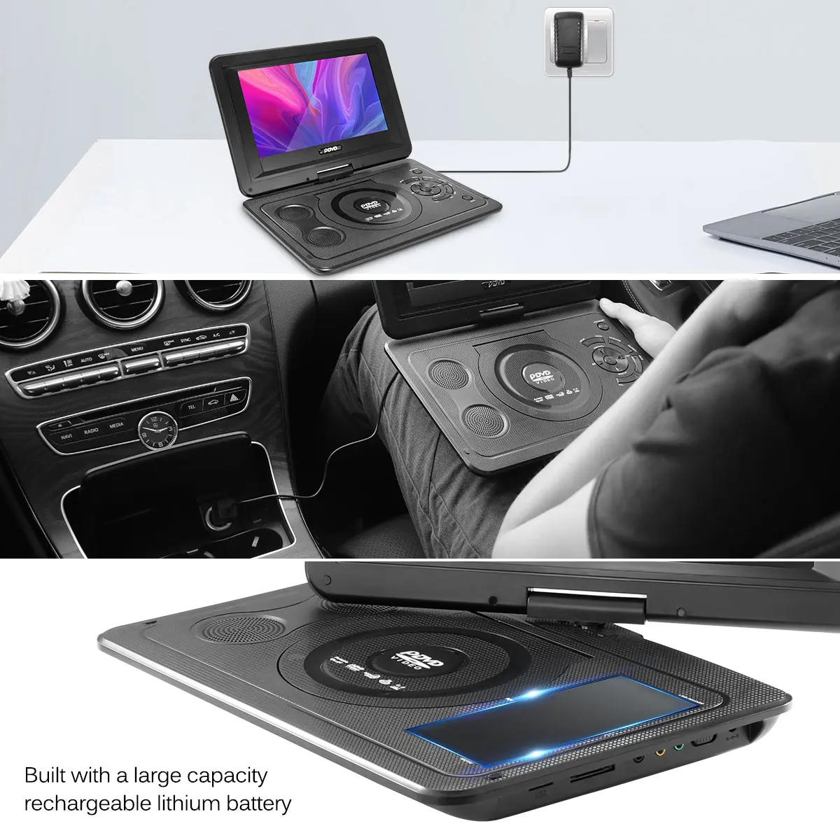 Этот dvd-плеер является высоким разрешением и высококачественным вещательным оборудованием. Это многофункциональное сочетание dvd-плеер, ТВ плеер, FM радио приемником, чтение карт памяти, играть в игры, и так далее. Оснащен перезаряжаемой литиевой батареей для долгой работы, полностью подходит для дома, офиса, автомобиля и других случаев.