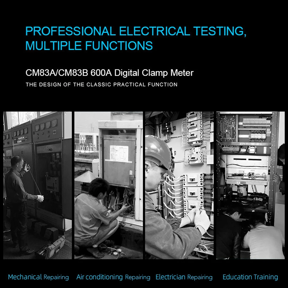 CM83A Функция: ручной диапазон, 600A переменного тока, измерение сопротивления (0-6 кОм), непрерывность/диод, измерение емкости, напряжение постоянного тока 600 В, напряжение переменного тока 600 В, NCV Бесконтактное Обнаружение напряжения переменного тока, Зажим фонарик/подсветка, хранение данных.
