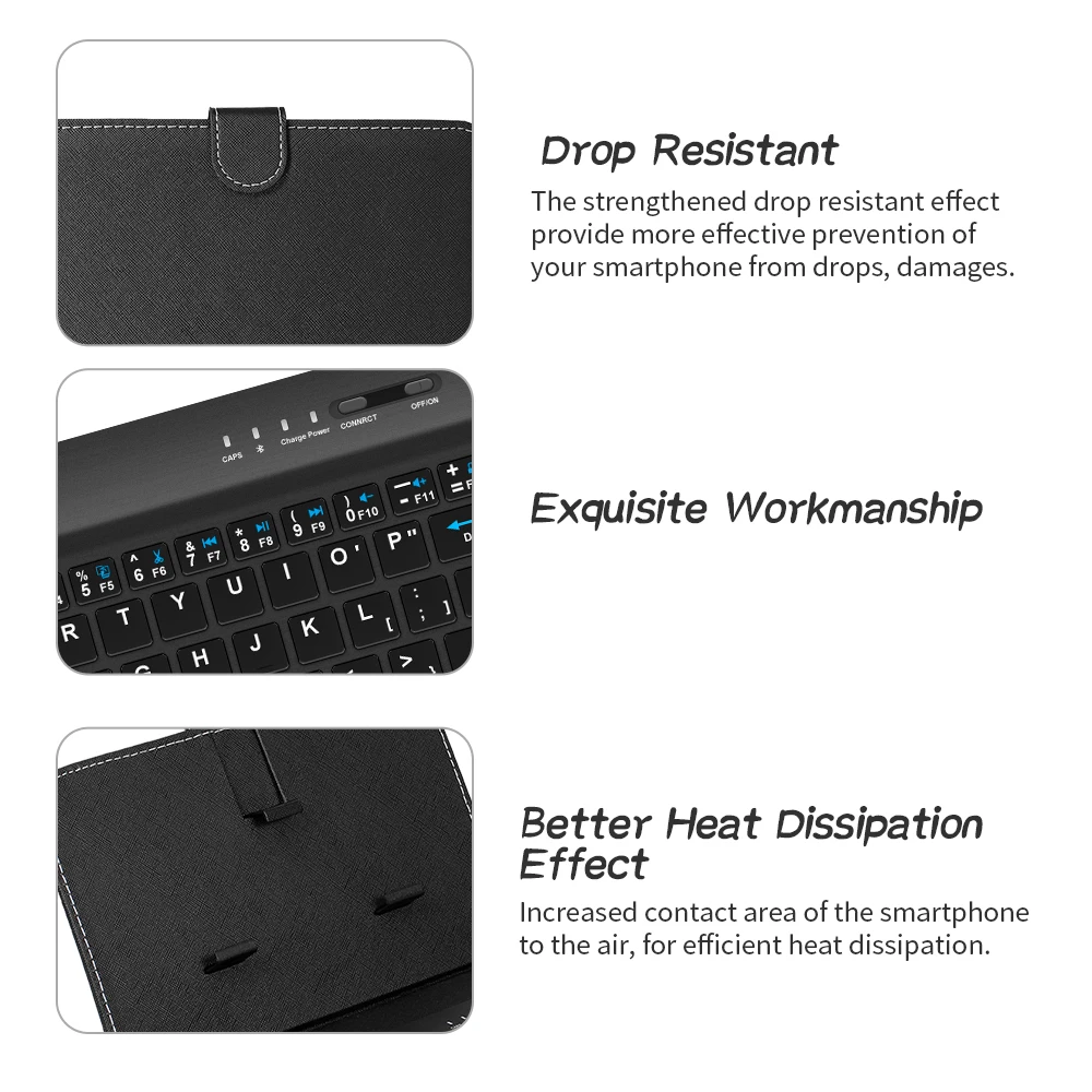 BT клавиатура с чехол разработан специально для 4,5-6,8 дюймов мобильные телефоны, принимая конструкция, поглощающая электромагнитное излучение для того, чтобы сделать клавиатура прочно впитывается в чехол и легко снять, для большего удобства использования мобильных телефонов. Особенности: Высокое качество. Чехол из искусственной кожи и клавиатура ABS BT специально разработаны высокого качества, экологически чистые, устойчивые к пыли, воде и царапинам, И также может защитить ваши мобильные телефоны от царапин или пыли и воды и т. Д. Магнитное поглощение. Клавиатура BT магнитно впитывается в защитный чехол в прочной и стабильной степени, а также легко снимается для большего удобства. Широкая совместимость. Совместим с разнообразными устройствами с 4,5-6,8 дюймов мобильные телефоны. Уникальный дизайн подставки. Уникальный дизайн подставки обеспечивает стабильную поддержку смартфона при просмотре фильмов или наборе текста, что позволяет сложить его, когда он не используется, не занимает места. Быстрый ввод текста. Клавиатура BT имеет уникальный дизайн клавиш для быстрого и удобного ввода текста. И легко подключается через BT к вашим устройствам. Лучший эффект рассеивания тепла Увеличенная площадь контакта смартфона с воздухом для эффективного рассеивания тепла. Легкий дизайн. Легкий и тонкий дизайн, легко и удобно носить с собой и использовать. Спецификация: Товар: клавиатура и чехол Защитный чехол: Цвет: черный Материал: искусственная кожа Совместимость смартфона: для 4,5-6,8 дюймов Размер: 22,7*14*3 см/8,9*5,5*1,2 дюймов Вес: 179 г/6,3 унций Клавиатура: Цвет: черный, белый (по желанию) Расстояние передачи: 10 м Модуляции: 2,4 ГГц Рабочее напряжение: 3-5 В Рабочий ток: <4.0ма Ток в режиме ожидания: 20UA Ток сна: <2μA Ток зарядки: ≥ 100 мА Сила нажатия клавиш: 80 ± 10 г Нажатие клавиш: 5 миллионов кликов Рабочая температура: -10 ℃ - + 55 ℃ Влажность: 20-50% Размер: 19,8*12,5*0,6 см/7,8*4,9*0,2 дюймов Вес: 122g/4,3 oz Посылка включает: 1 * Клавиатура с Чехол 1 * USB кабель