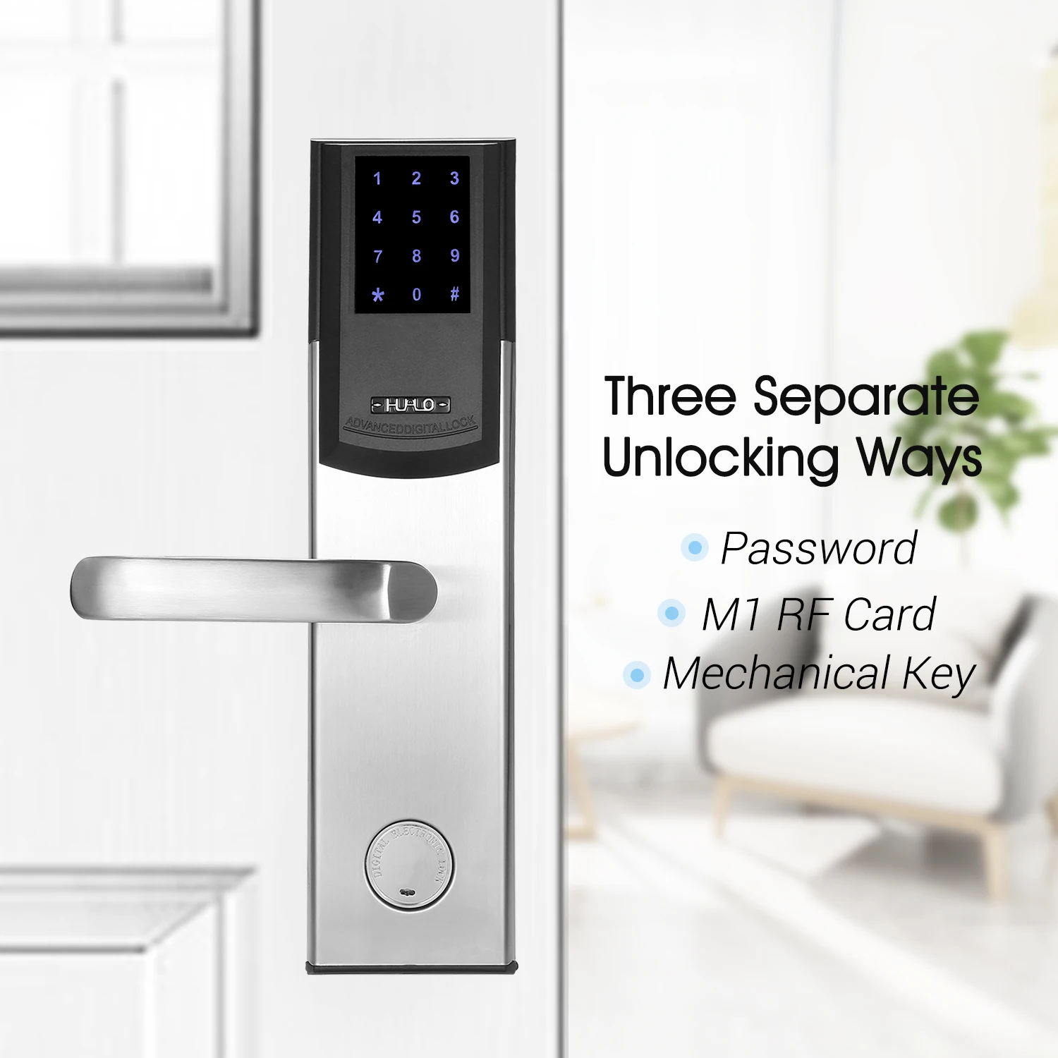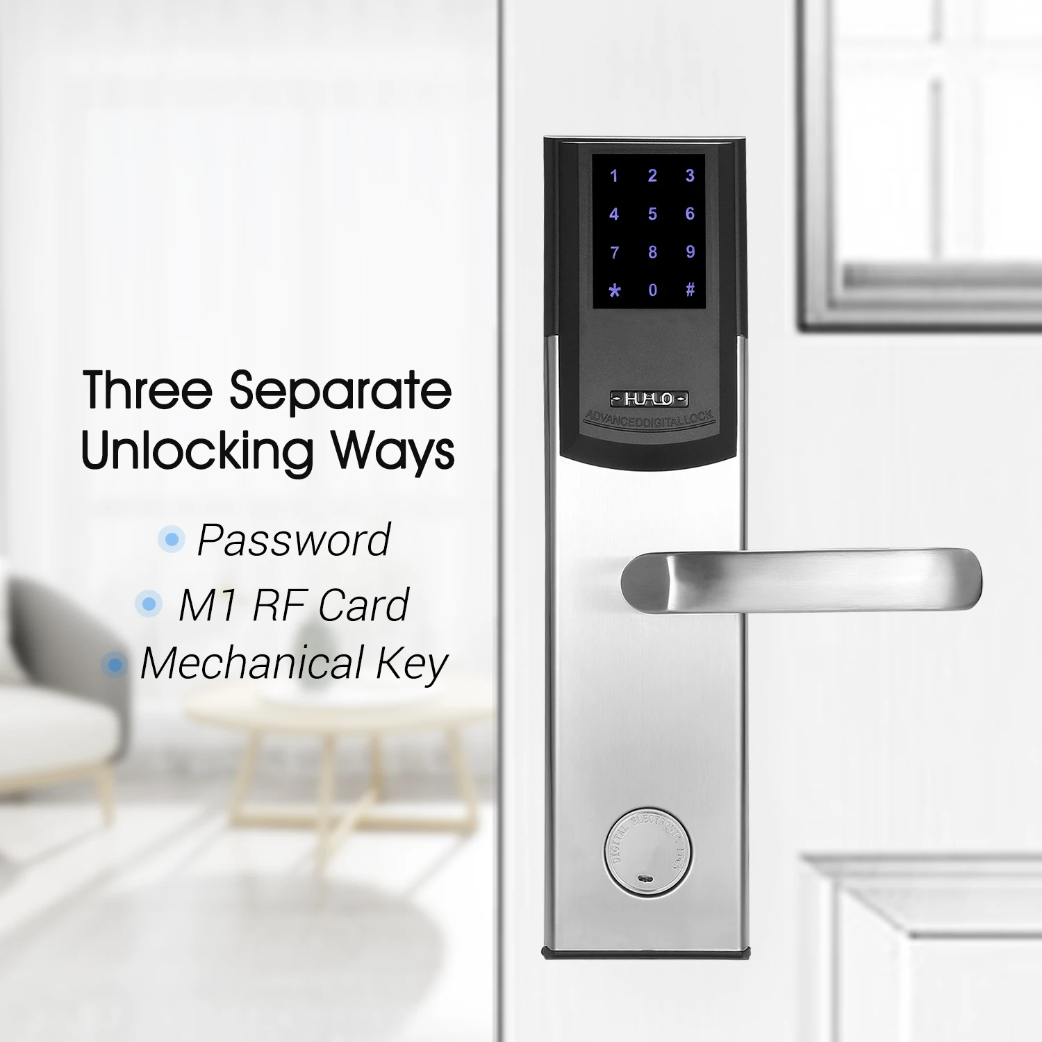 Три отдельных способа разблокировки-пароли, радиочастотные карты и механические ключи доступны для открытия двери.