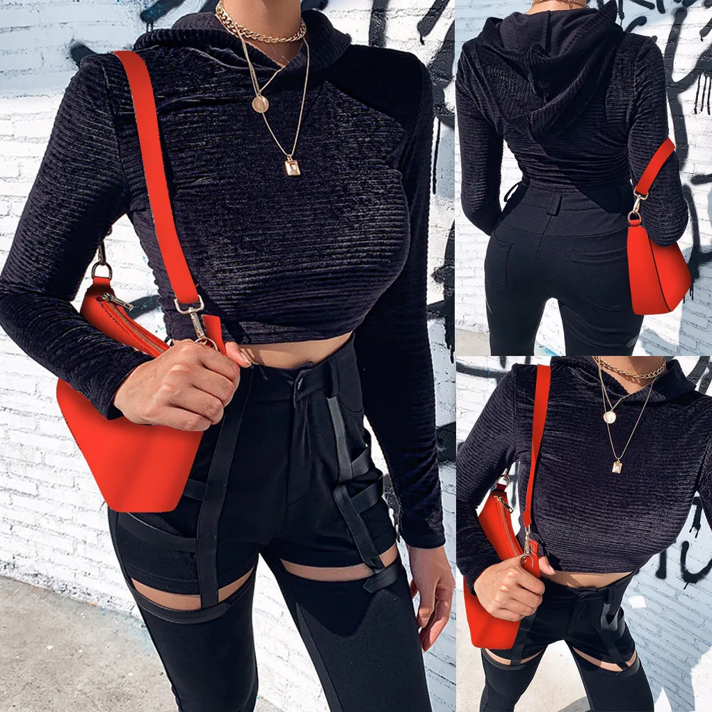 Вельветовый материал, Женская толстовка с капюшоном, 2020, новые модные тренды, однотонные, с длинным рукавом, короткие толстовки, блузки, топы, черные