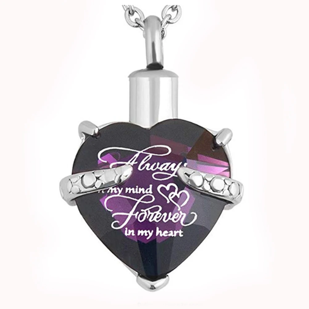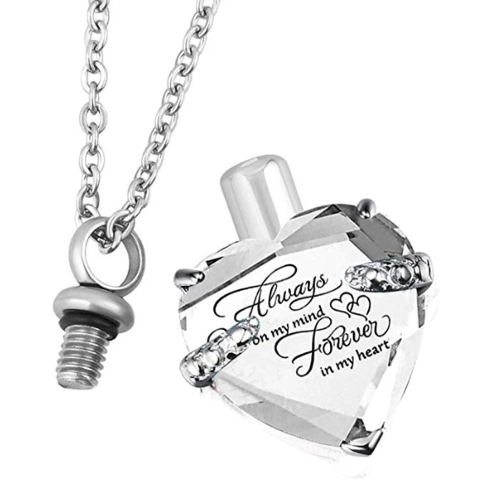 * "Всегда на уме навсегда в моем сердце". Элегантный гравированный лазером цветной стеклянный камень выгравирован внутри стекла, поэтому травление никогда не отслаивается. Это урна ожерелье вмещает пепел, волосы, сушеные цветы, эфирные масла.