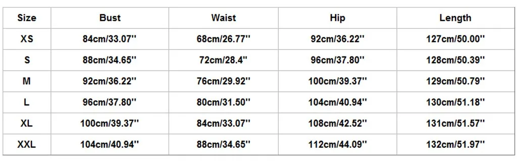 Размер Обхват груди Обхват талии Обхват бедер Длина XS 84 см/33,07'' 68 см/26,77'' 92 см/36,22'' 127 см/50,00'' S 88 см/34,65'' 72 см/28,4" 96 см/37,80'' 128 см/50,39'' М 92 см/36,22'' 76 см/29,92'' 100 см/39,37'' 129 см/50,79'' L 96 см/37,80'' 80 см/31,50'' 104 см/40,94'' 130 см/51,18'' XL 100 см/39,37'' 84 см/33,07'' 108 см/42,52'' 131 см/51,57'' XXL 104 см/40,94'' 88 см/34,65'' 112 см/44,09'' 132 см/51,97''