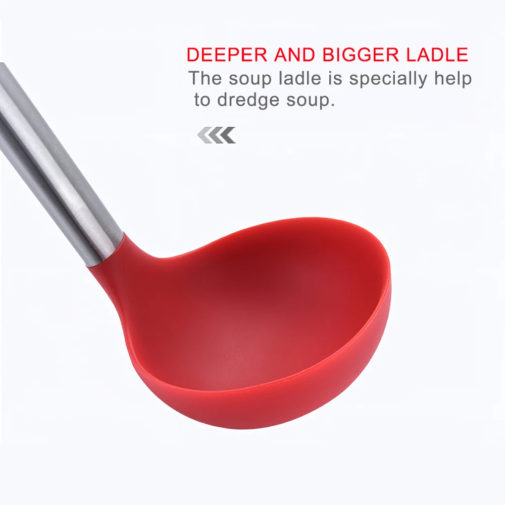 Наш набор кухонной посуды из силикона включает в себя: Тонг, ковш с прорезями, Шлицевой Тернер, Паста Сервер, венчик, шпатель, твердый Тернер, суповый ковш.