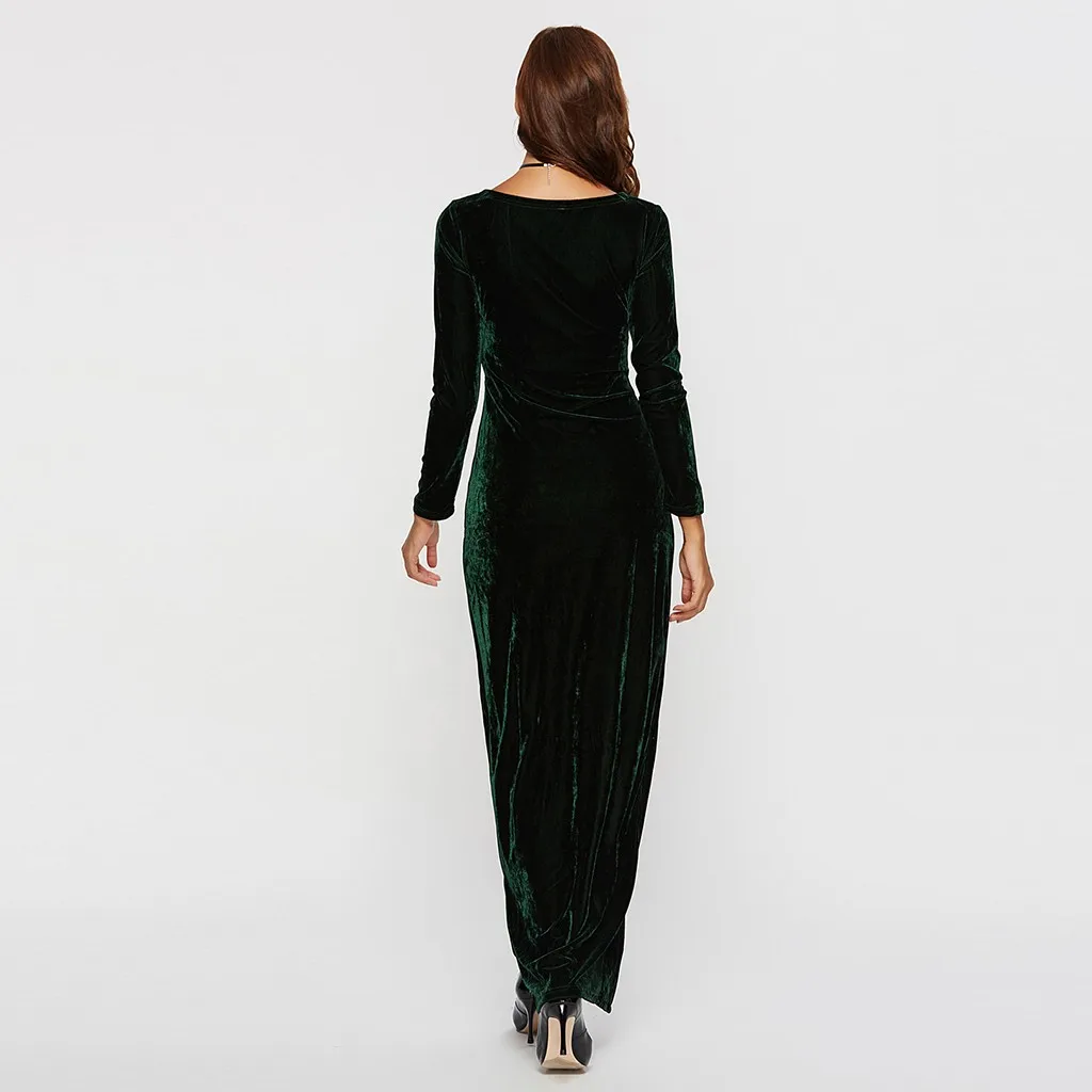 Женское вечернее бархатное темно-зеленое платье с v-образным вырезом и длинным рукавом.