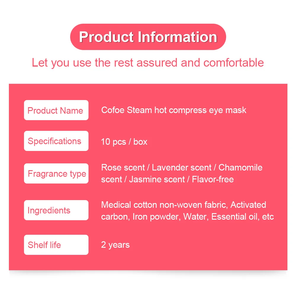 【Specifiction】 ☀Название продукта: Cofoe Паровая маска горячего сжатия для глаз ☀Технические характеристики: 10 шт./кор. ☀Тип аромата: аромат розы/аромат лаванды/аромат ромашки/аромат жасмина/без вкуса ☀Состав: медицинская хлопковая Нетканая ткань, активированный уголь, железный порошок, вода, эфирное масло и т. д. ☀Срок годности: 2 года