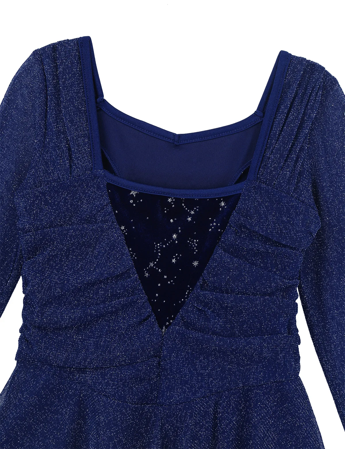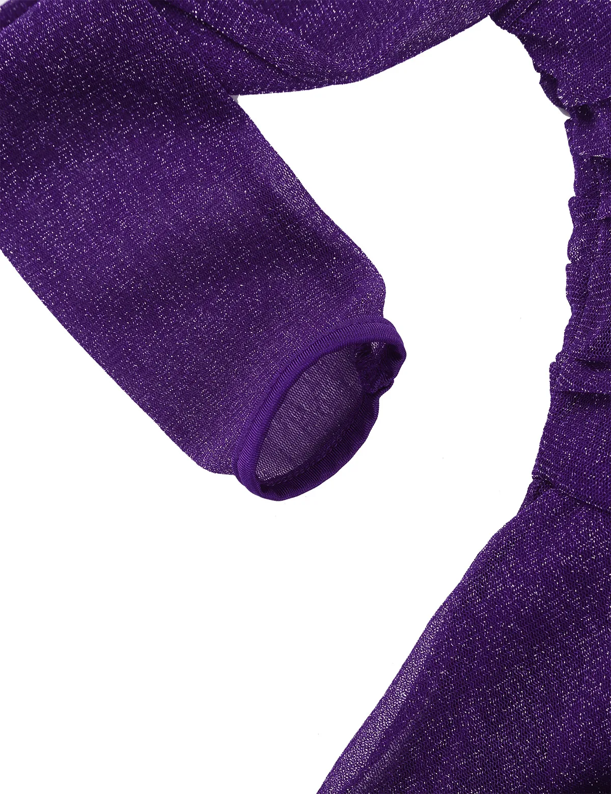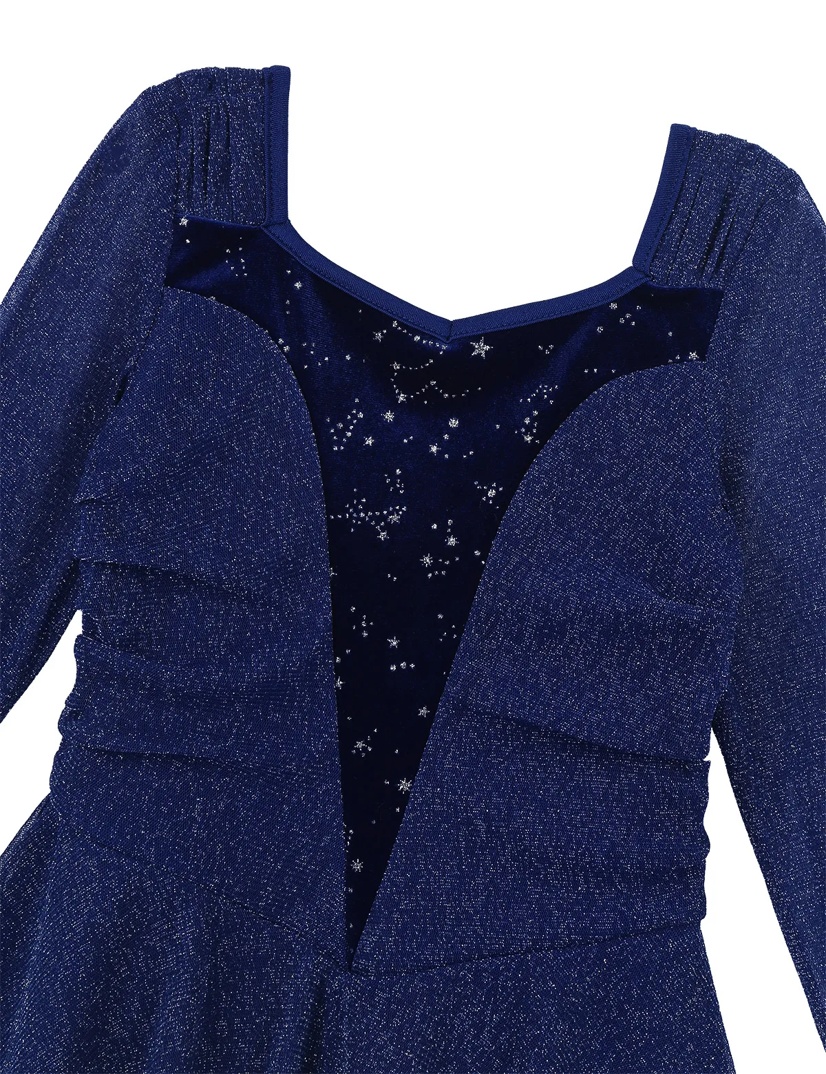 Блестящие просвечивающие длинные рукава, замысловатый серебристый Блестящий бархат вырезается в лестной изогнутой форме спереди и сзади. Лиф с подкладкой.