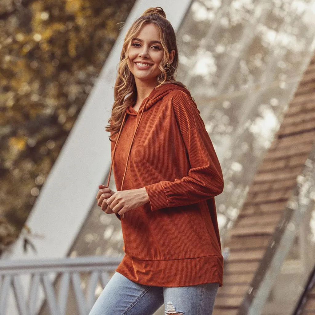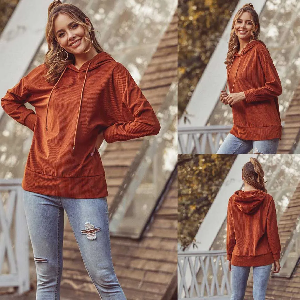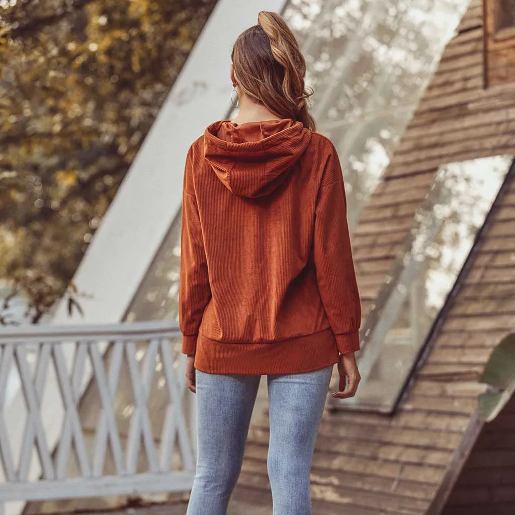 Женский вельветовый свитер, осень 2020, винтажный Повседневный пуловер с карманами и длинным рукавом, с капюшоном, коричневый цвет