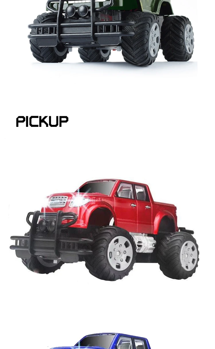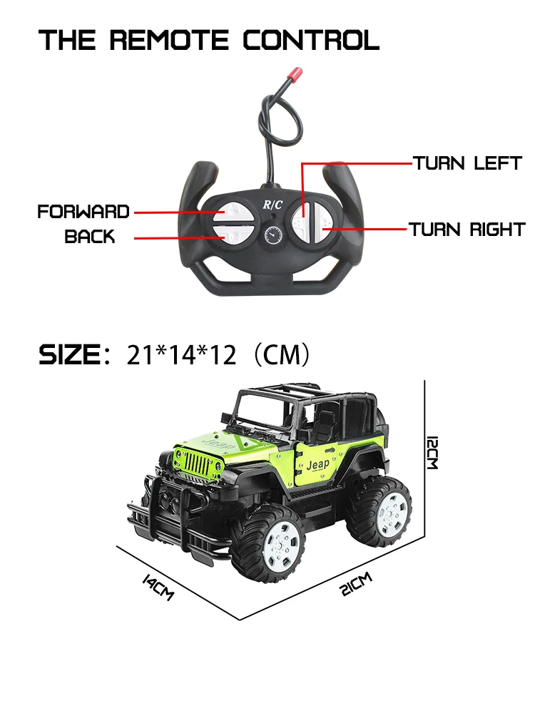 Название продукта: джип внедорожный пульт дистанционного управления игрушечный пикап Внедорожник пульт дистанционного управления игрушка с подсветкой музыкальная игрушка автомобиль Параметры: все модели имеют два освещения! Музыка и без музыки Цвет: джип: красный, желтый, зеленый, синий (пластиковая версия) Красный оранжевый зеленый синий (версия из сплава) Пикап: красный и синий (пластиковая версия) Музыка: каждый цвет и каждый стиль имеют музыку или нет музыкальной версии. Та, с музыкой на опции-музыкальная версия, а та, с высокой ценой-музыкальная версия О освещении: каждый стиль имеет освещение • Размер: 14 см * 21 см * 12 см Расстояние дистанционного управления: 20 метров Аксессуары для товаров: пульт дистанционного управления carA