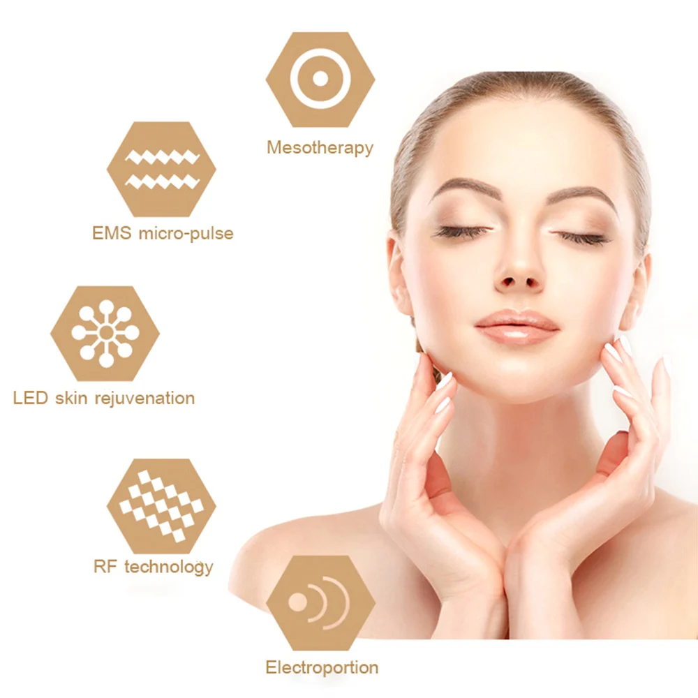 Косметический инструмент для электропорации, фокусировка импортной электропорации, бесигольчатая мезотерапия, радиочастотный ток RF, технологии обработки энергии светодиодного светильника, 5 регулируемых уровней интенсивности и 6 дополнительных режимов светодиодного освещения в соответствии с типом кожи и личными предпочтениями, позволяют синхронизировать решение проблем нескольких лет и светить естественный молодой цвет вашей кожи!