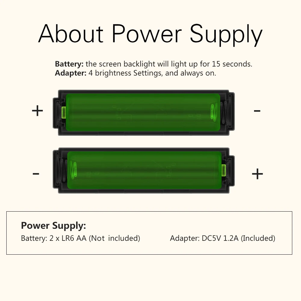 4 уровня яркости подсветки Выберите с адаптером питания. Подсветка поддерживает только освещение с адаптером питания. Если Погодная станция работает только с батареей, задний светильник активен только в течение 15 секунд, нажмите кнопку «светильник», это может немного трудно увидеть дисплей без задний светильник.