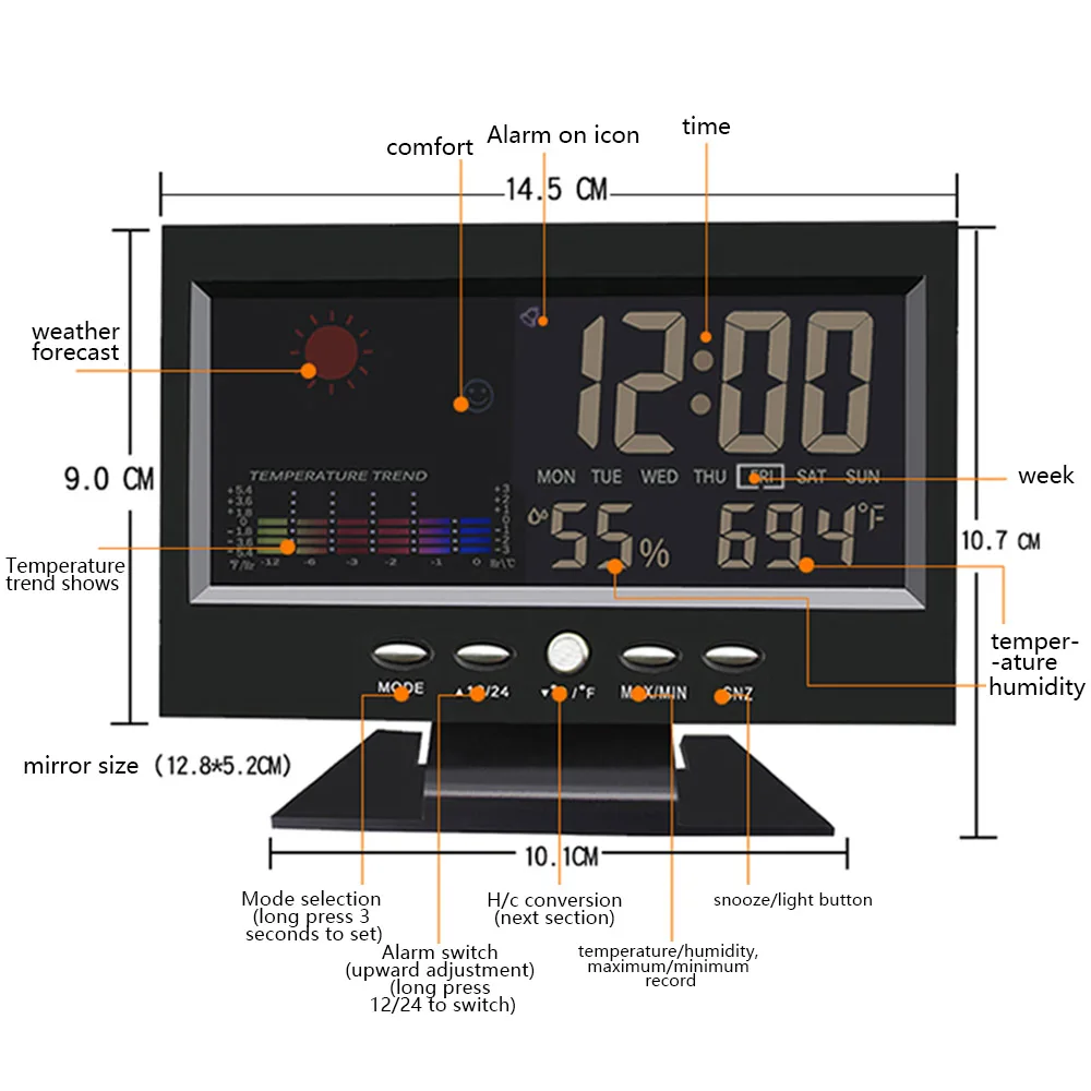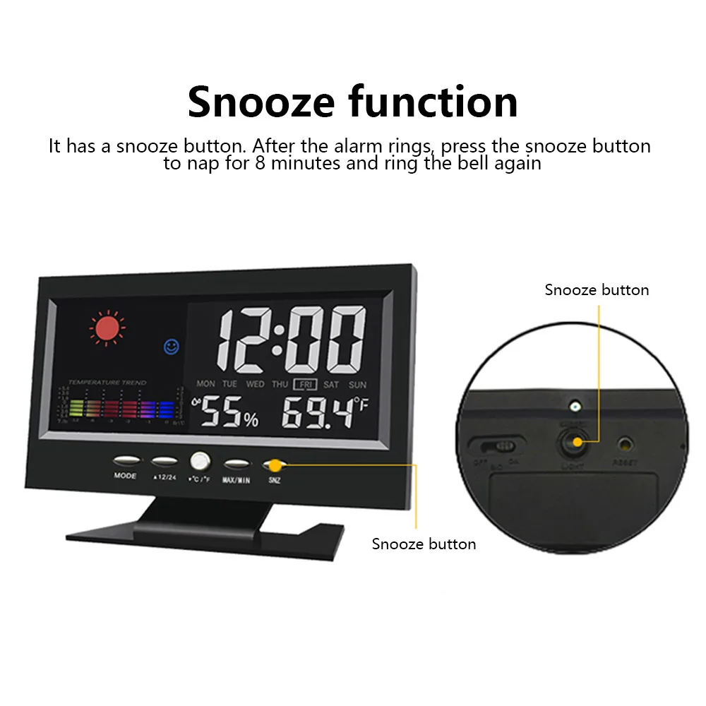 Категория продукта: многофункциональные электронные часыНажмите на кнопку «светильник», чтобы включить или выключить светильник. Вы также можете включить светильник, нажав на кнопку в пределах 1 метра или нажмите на таблицу, чтобы включить задний светильник. Светильник отключается в течение 5 секунд. Удобно для использования в ночное время просмотра.
