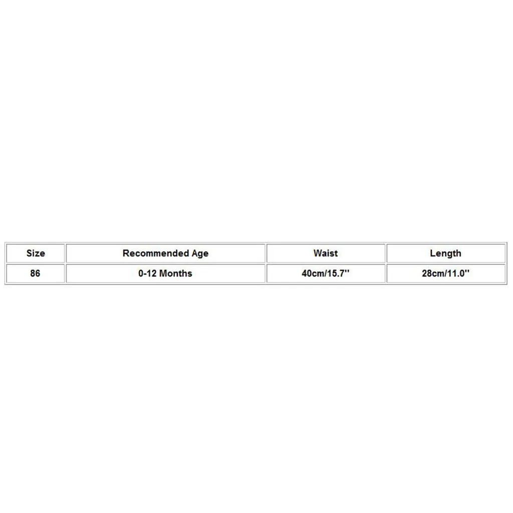 Размер Рекомендуемый возраст Обхват талии Длина 86 Для детей возраста от 0 до 12 месяцев 40 см/15,7'' 28 см/11,0''