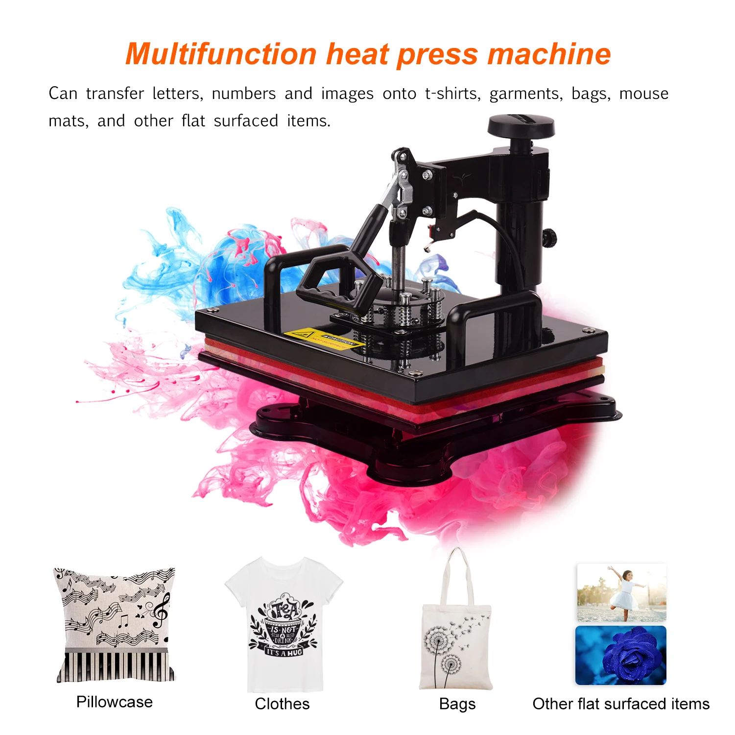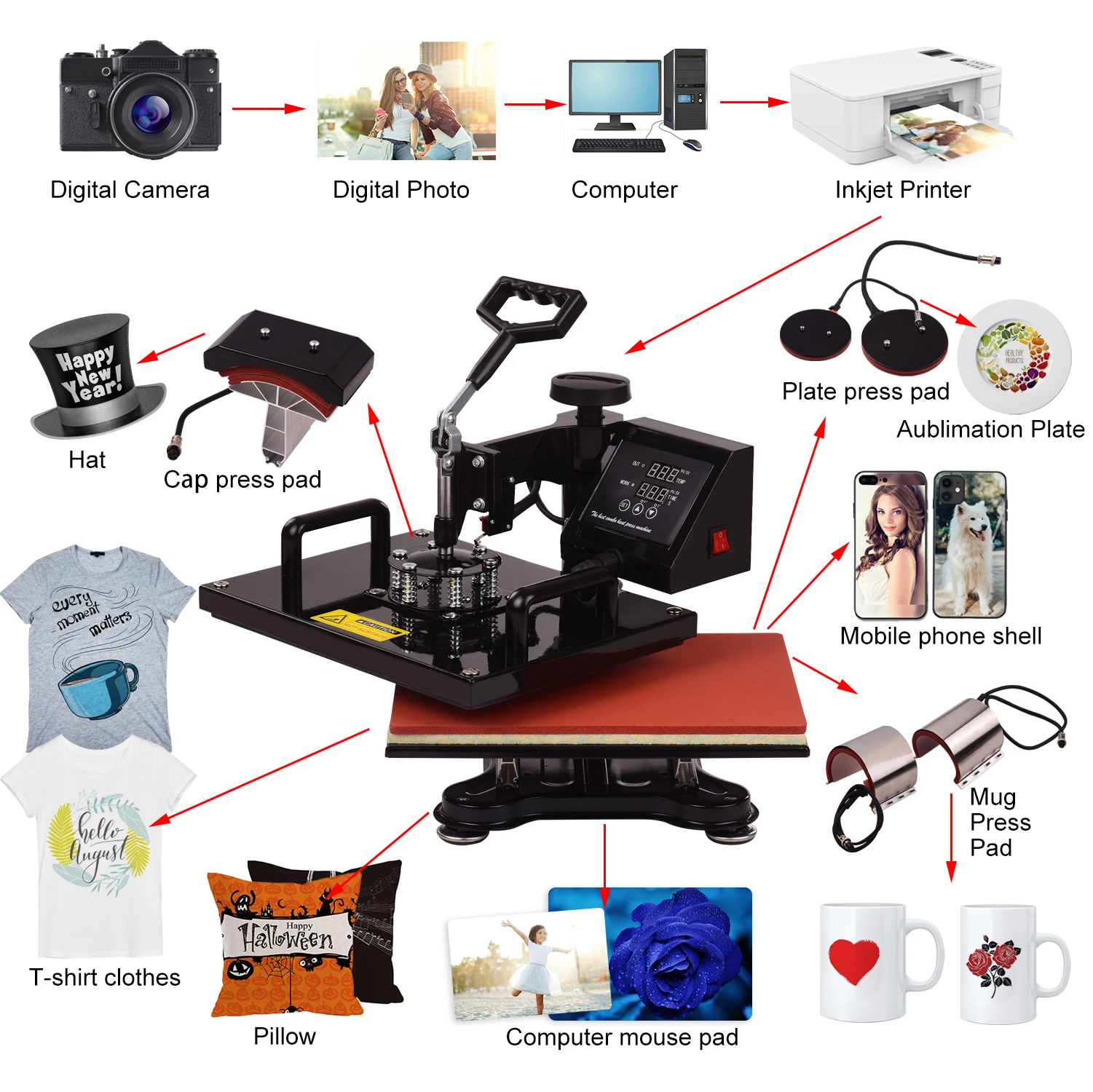Машина для термопечати может передавать буквы, цифры и изображения на футболки, одежду, сумки, коврики для мыши, керамическую плитку, тарелки, колпачки, кружки и другие предметы с плоским покрытием. Идеально подходит для хлопка, волокна, металла, керамики, стекла. Подходит для производства подарков, рекламы.