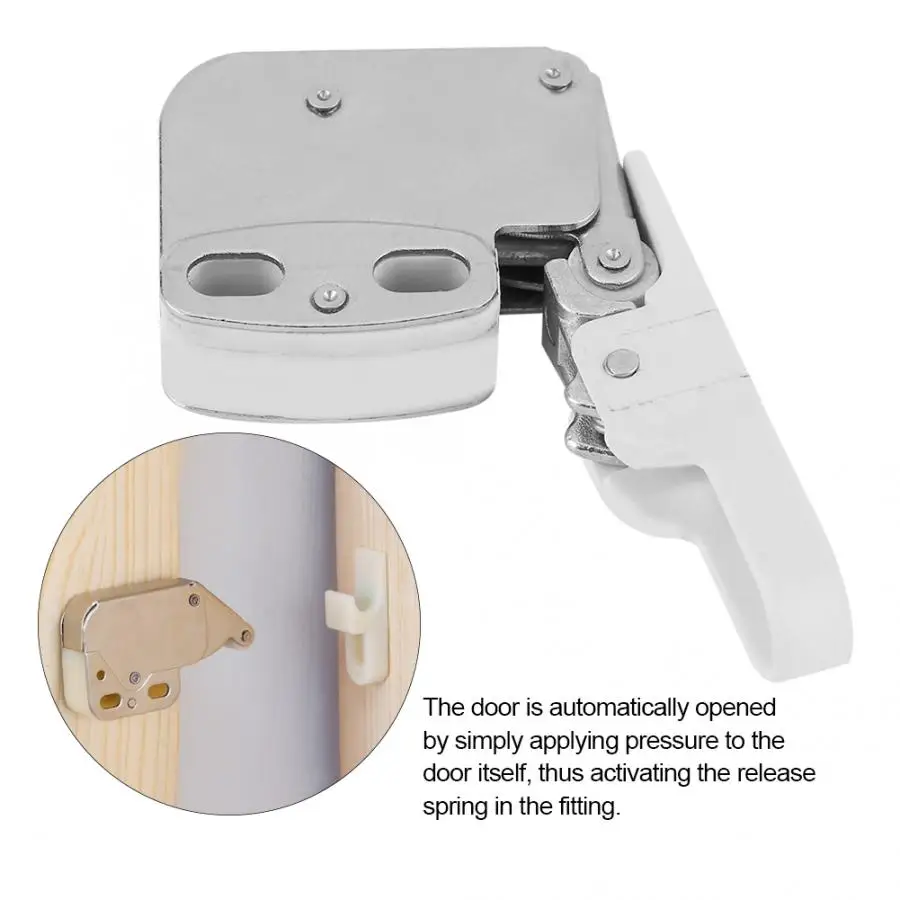 Дверь автоматически открывается, просто надавливая на саму дверь, тем самым активируя отпускную пружину в фитинге.