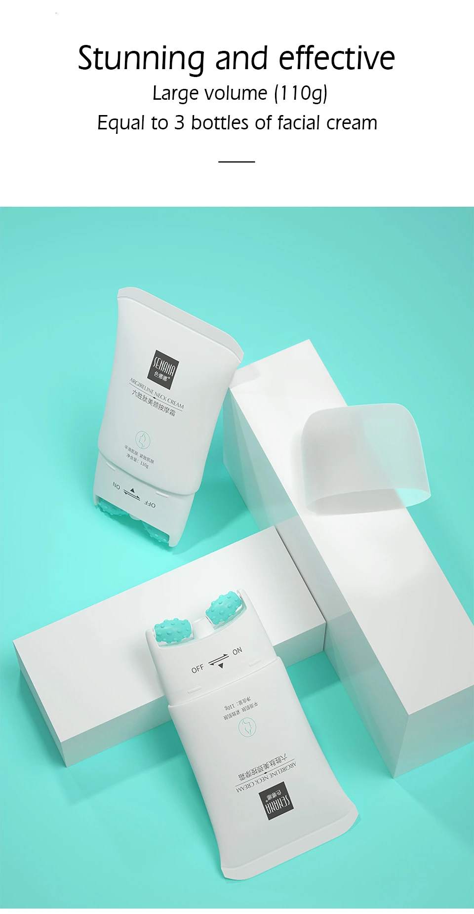 1.The neck is dry and has cervical stripes,After applying it, it is really weakened. The effect of neck cream is really great. The cream is refreshing and well absorbable. It contains hexapeptide and can tighten skin and beautify the neck. I have stuck to using it for a half month. My skin becomes tighter. The roller for massaging makes me feel extremely comfortable. I feel that my neck lines have relieved lot and my skin is much more watery and tenderer! 2.V-shaped massage roller ,The effect of weakening lines is better. The roller cream really makes me feel very comfortable. I have applied it for several months. My cervical stripes have been apparently weakened. I feel my neck is much thinner and my neck becomes smoother. After wearing the necklace, my neck looks much pretty. I feel that my temperament is much better~