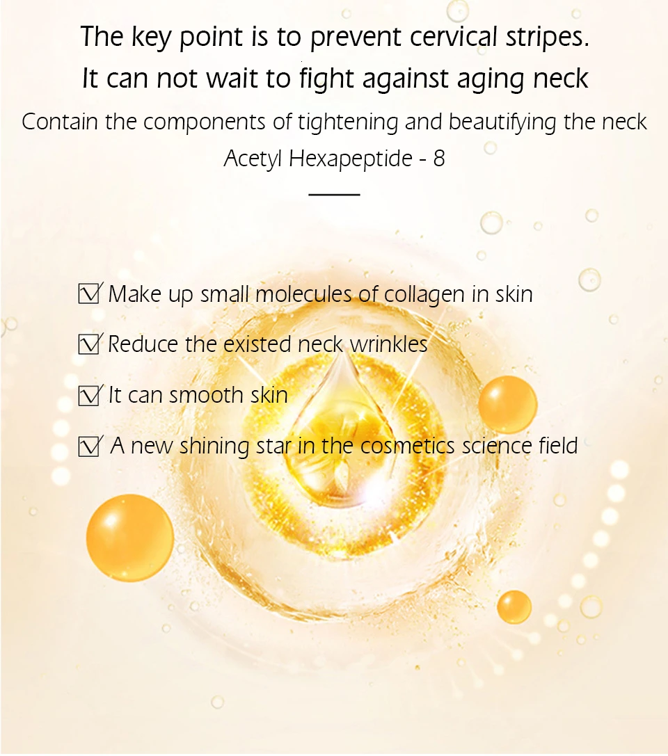 Contain the components of tightening and beautifying the neck -- Acetyl Hexapeptide - 8 1.Make up small molecules of collagen in skin 2.Reduce the existed neck wrinkles 3.It can smooth skin 4.A new shining star in the cosmetics science field