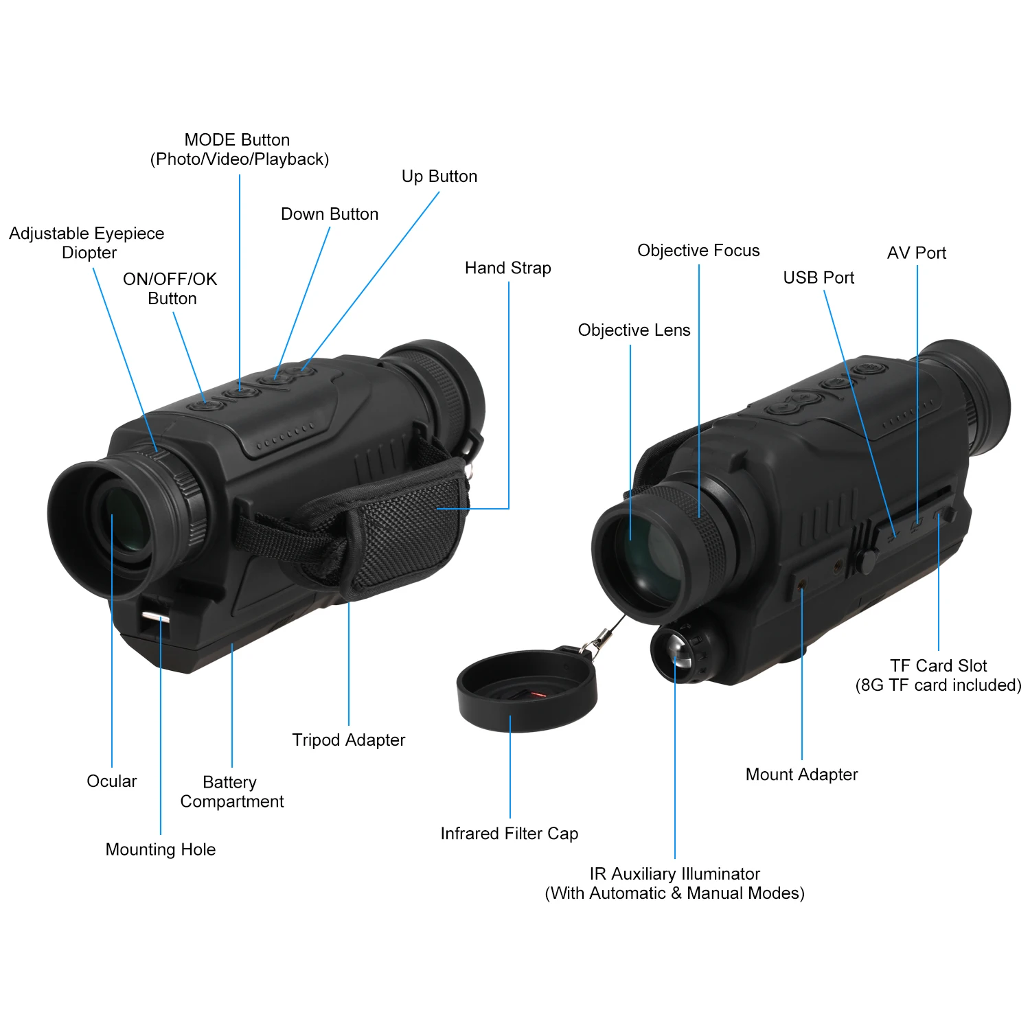 Это цифровое ночное устройство предназначено для дневного и ночного использования. Он имеет несколько функций, таких как камера, видео, Монокуляр. Между тем устройство имеет экранРегулировка яркости и регулировка освещения. Увеличение в 5 раз позволяет четко видеть объекты. Специальный инфракрасный вспомогательный осветитель с автоматическим и ручным режимами, пользователь может видеть дальнюю мишень на 200 м в полной темноте.