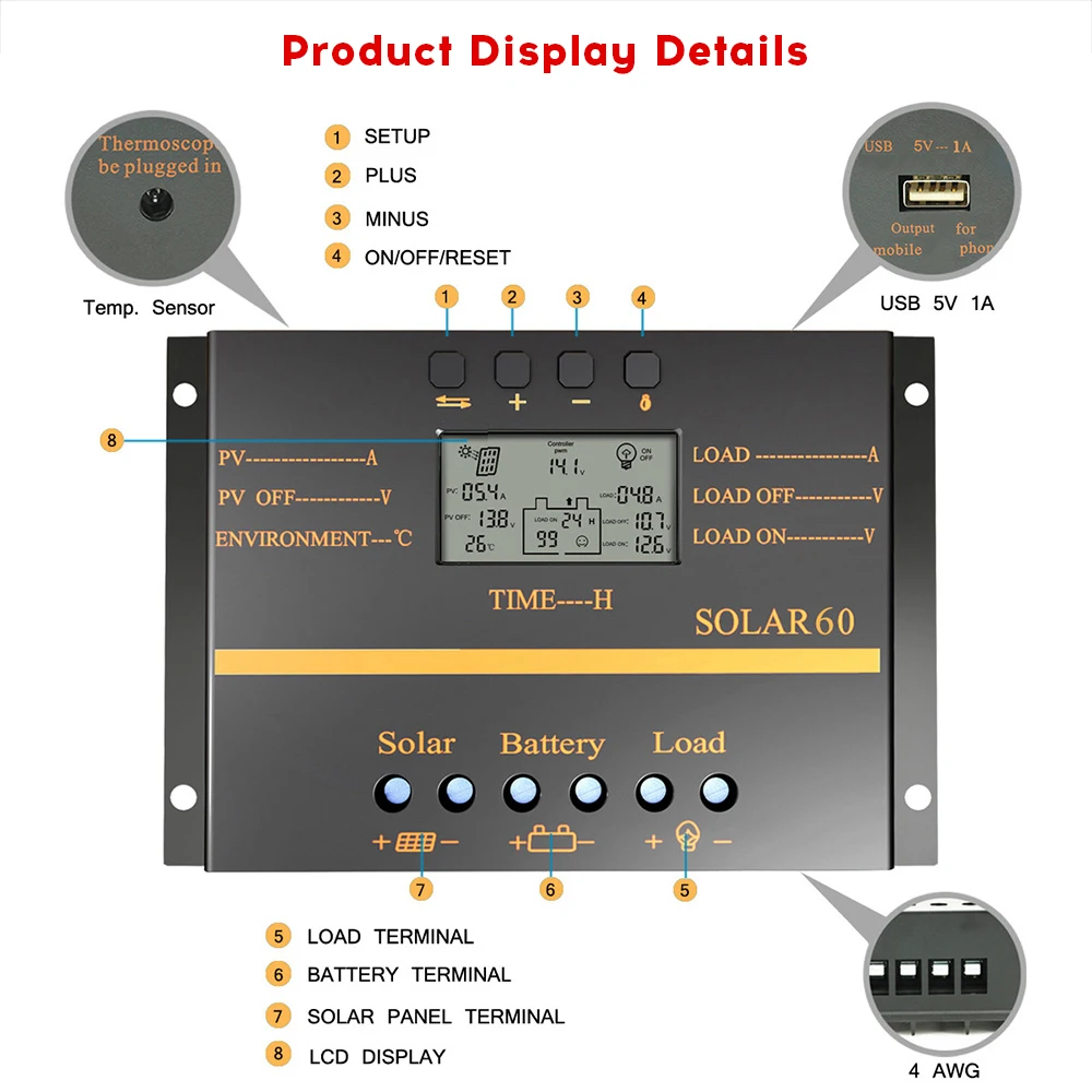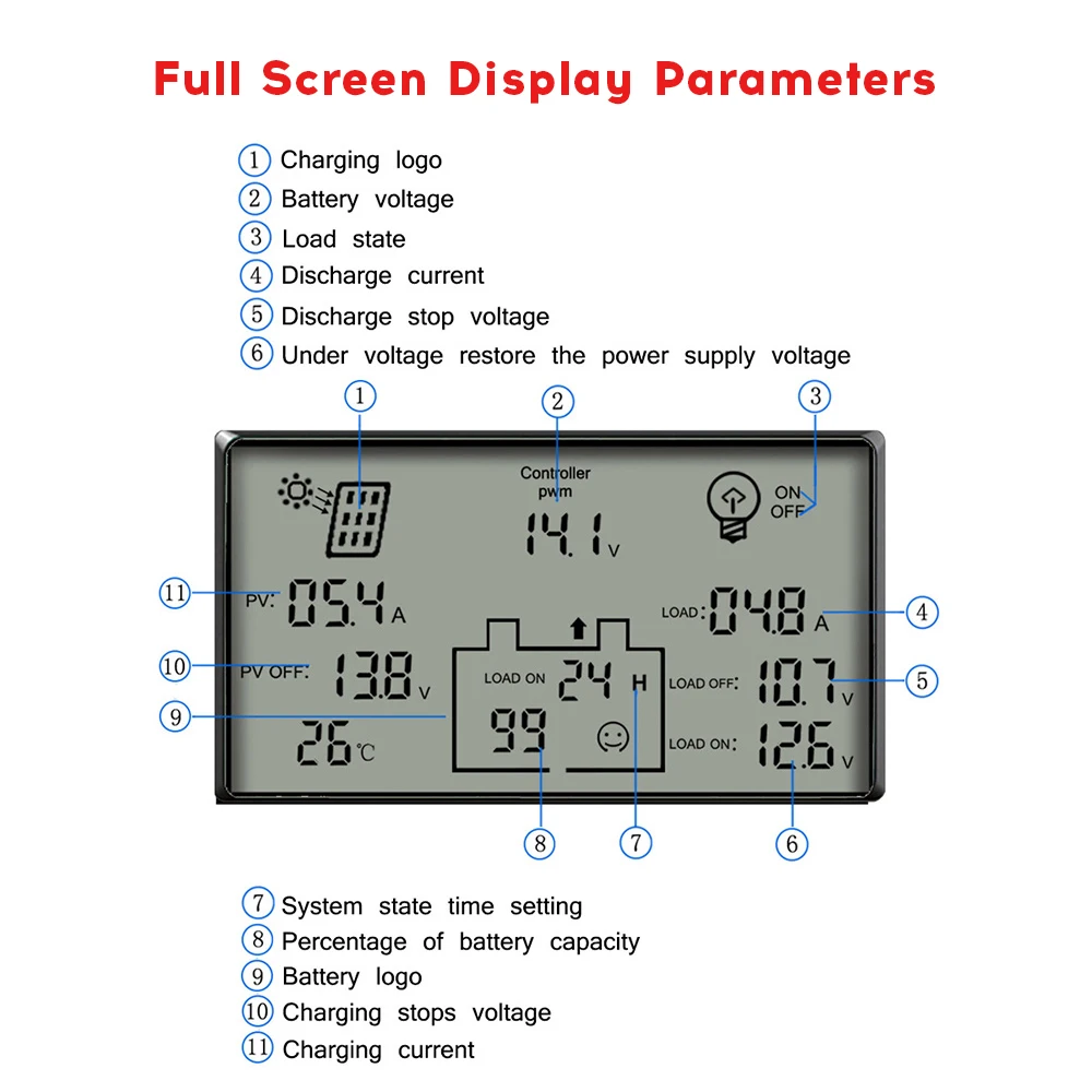 Солнечный контроллер имеет тонкий внешний вид, легкий, удобный для установки и удаления. Большой ЖК-экран, четкие цифры, защита от царапин. Превосходная крышка из АБС-пластика, высокая термостойкость, стабильная и не легко деформируется. Интеллектуальный импульс для защиты цепи и ячейки, безопасный, быстрый и эффективный, ваш очень хороший помощник.