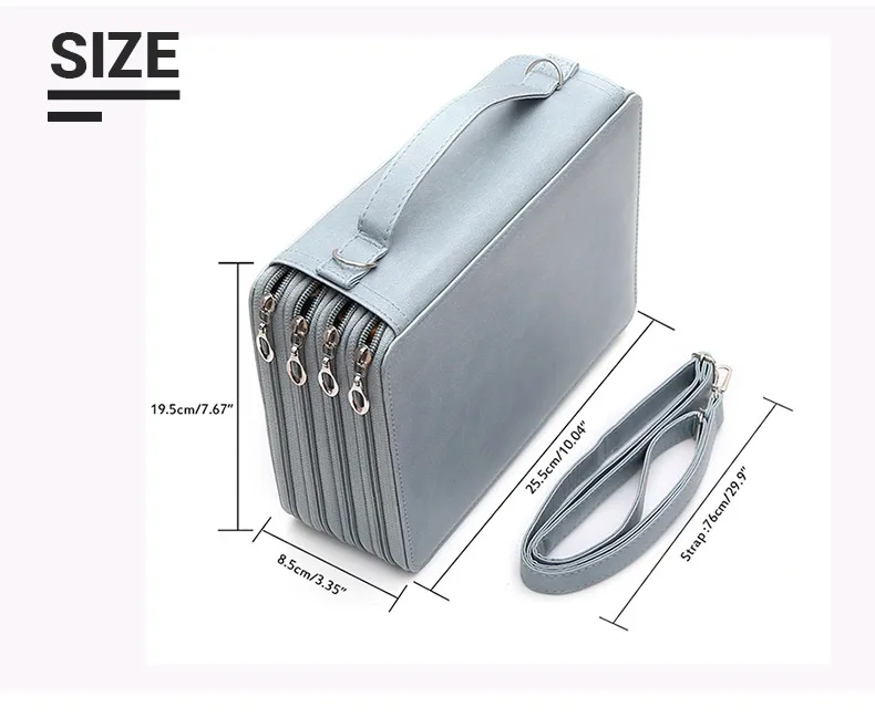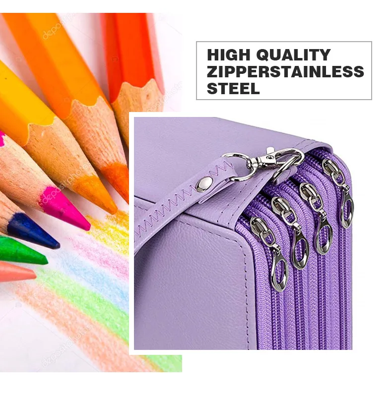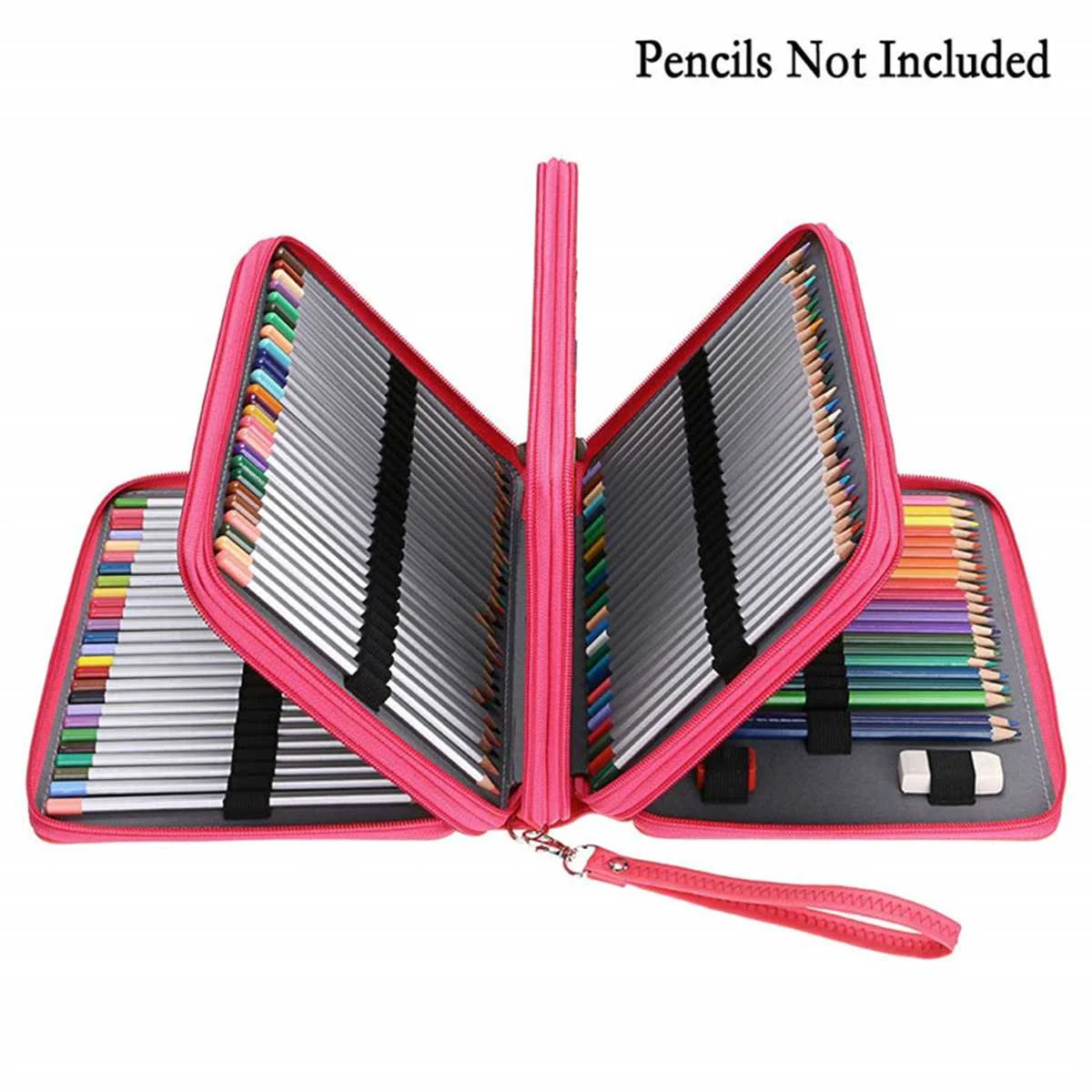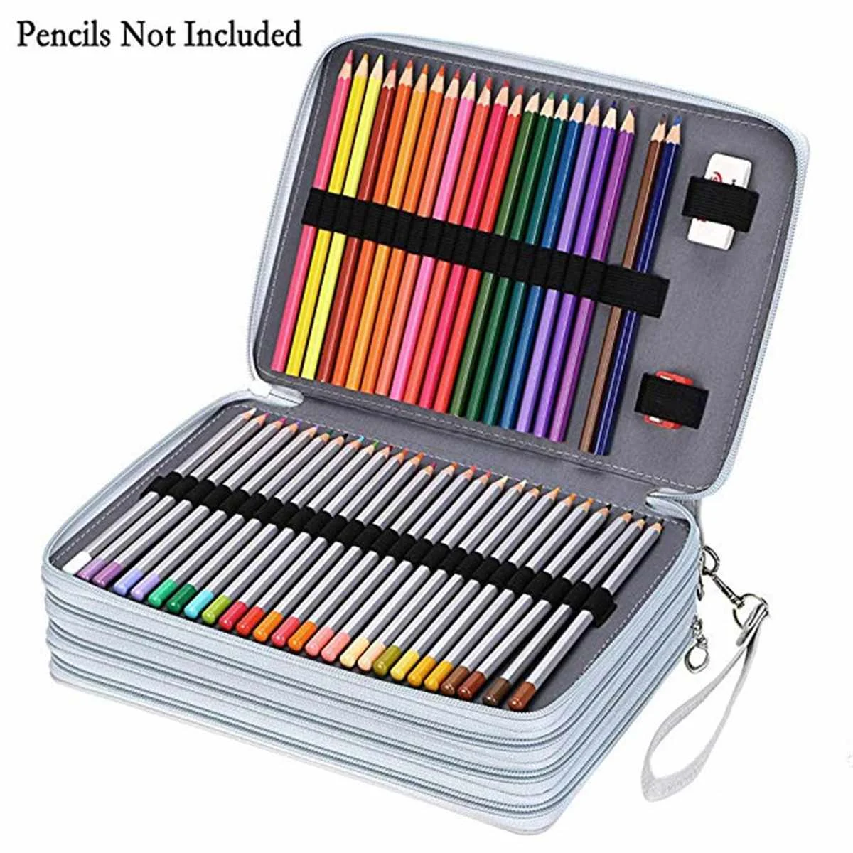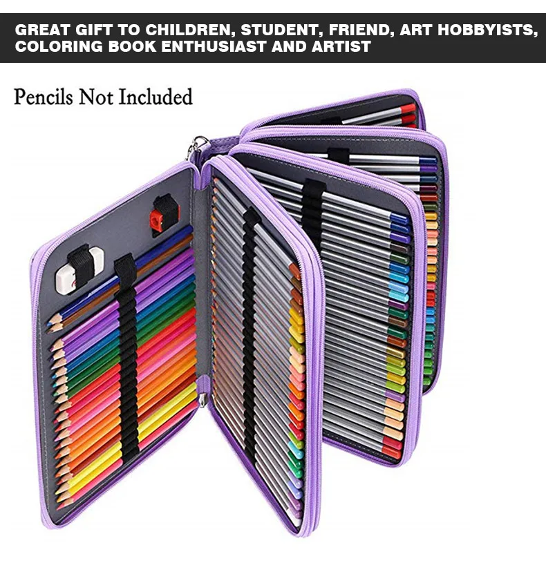 Он имеет 200 слотов для карандашей/ручек/гелевых ручек и 2 слота для ластика или точилки, каждый цветной карандаш или ручка имеет свое собственное отверстие/ремешок. Эластичный ремешок надежно удерживает каждый карандаш или ручку и предотвращает их выпадение или наступание.