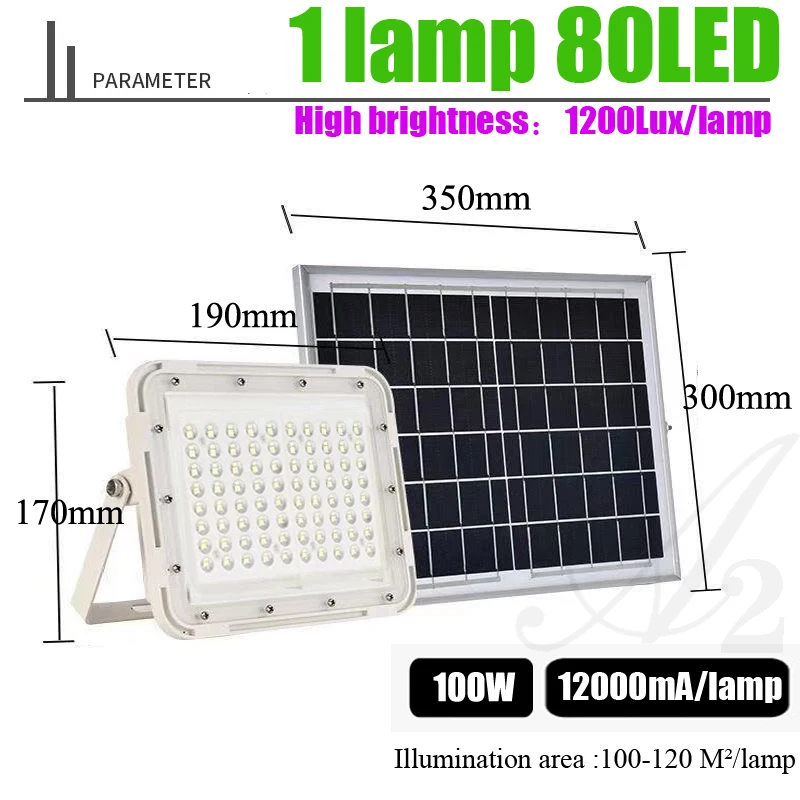Цвет излучения: белый светильник 6000-6500K; Световой поток: 1200-1500Lux. Площадь освещения: 100-120 квадратных метров; Размер лампы: 190*170*50 мм. Лампа Вес нетто: 0,9 кг. Размер солнечной панели: 350*300 мм. Вес нетто солнечной панели: 1,45 кг. Входная мощность солнечной панели: 6 В/12 Вт; Емкость аккумулятора: 12000 m A (32650 литий-железо-фосфатная батарея.) Время зарядки: 8-12 часов; Время работы: 12-18 часов (Полная батарея).