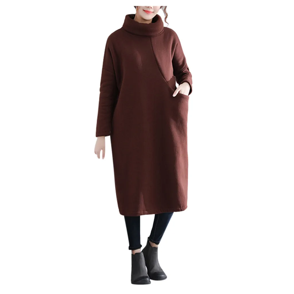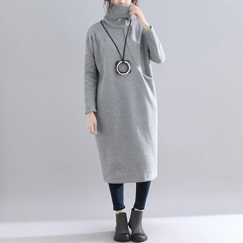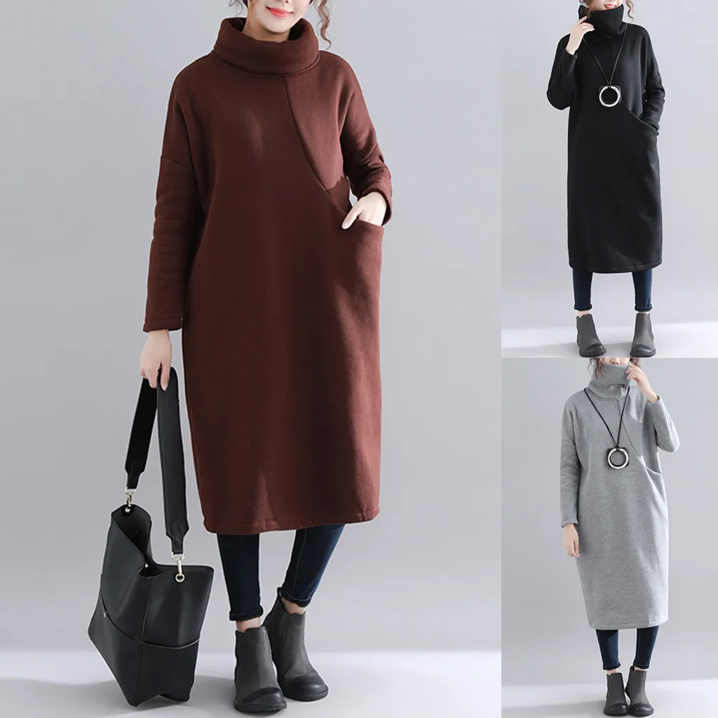 Женское длинное платье-рубашка с высоким воротником, простое платье-свитер средней длины