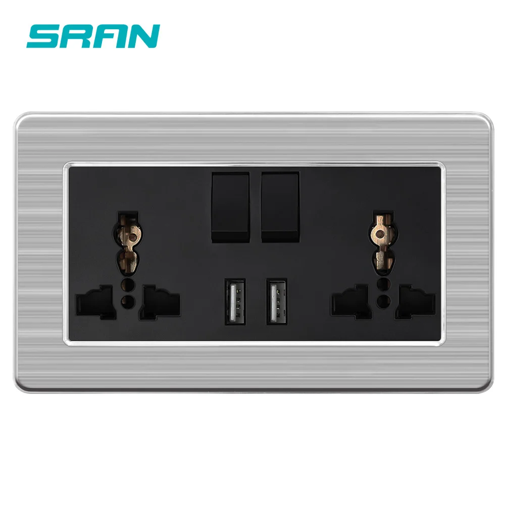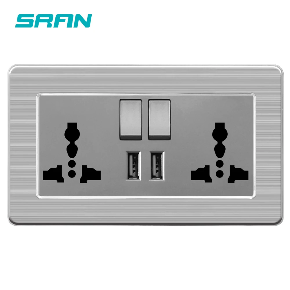 SRAN 2gang 13A универсальная Коммутируемая Розетка с двойным выходом USB 2.1A настенная розетка из нержавеющей стали матовая панель 146 мм * 86 мм