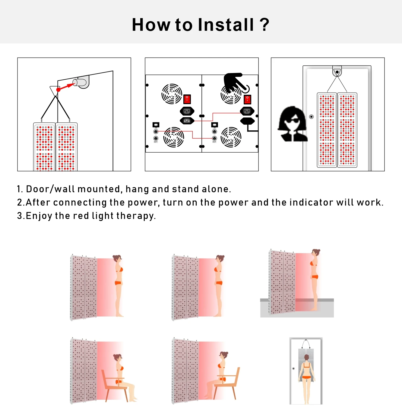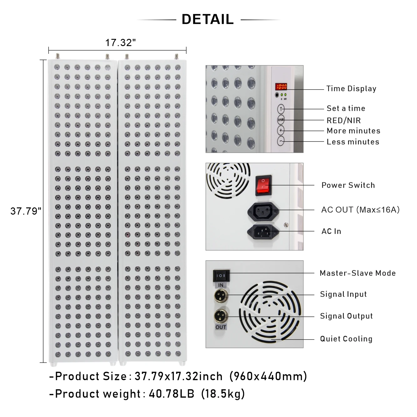 Название продукта: IL-TL300 + 300led светильник Светодиодный Кол-во: 360 шт. 3 Вт (по умолчанию)/5 Вт светодиодный чип Номинальная мощность: 510 Вт Два переключателя: красный и инфракрасный Длина волны: 660нм: 850нм = 1:1 Размер изделия: 37,79x17,32 дюйма (960x440 мм) Излучение:>100 мВт/см2 Вес продукта: 40.78LB (18,5 кг) Сенсорный экран Экран: Да Защитные очки: Да Гарантия: 2 года Что в коробке, если вы покупаете эту модель для использования? 2 TL300 светильник + 1 пара металлическая вешалка + руководство + кабель с настраиваемой вилкой + защитные очки