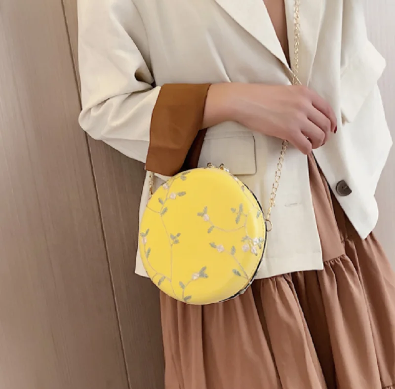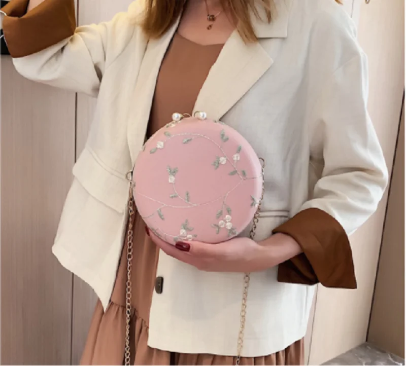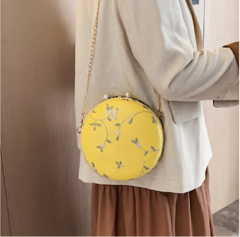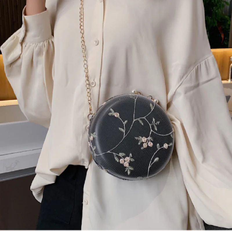 Женские круглые вечерние сумки-клатчи с вышитыми цветами, сумки на плечо с золотой цепочкой для девушек, вечерние сумочки