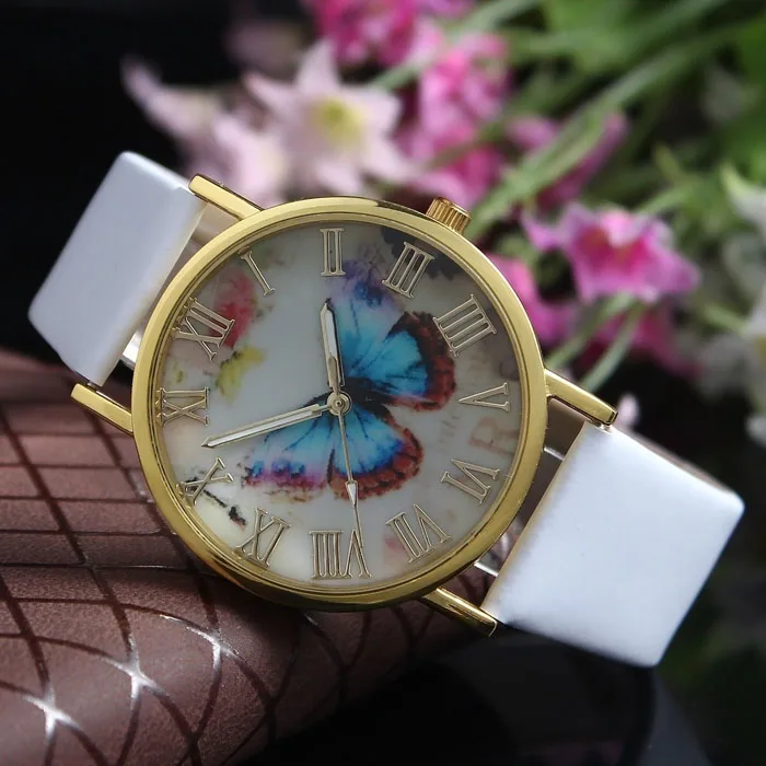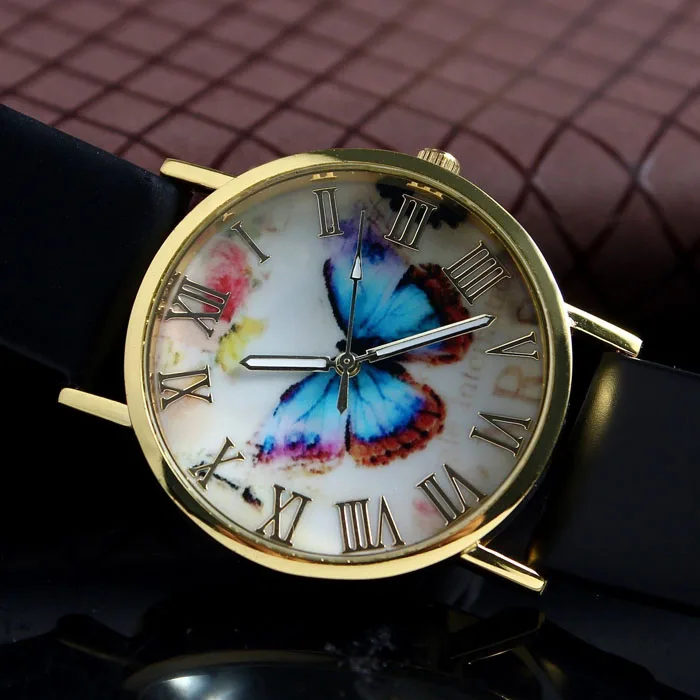 Модные женские наручные часы с бабочками и золотым циферблатом, кожаный ремешок черного и коричневого цвета, кварцевые наручные часы для женщин
