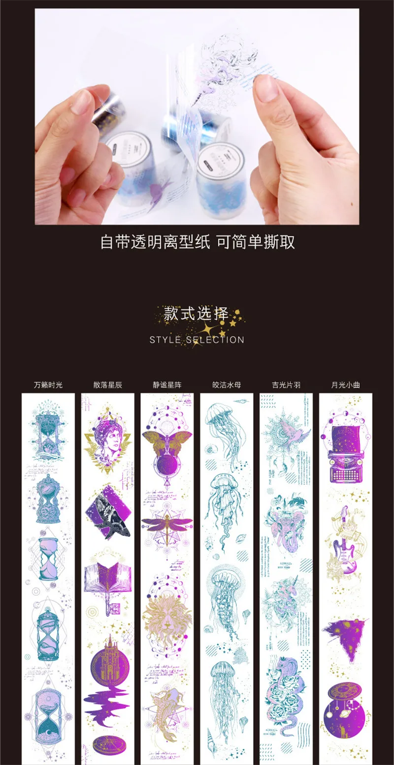 ПЭТ Бронзирующая лента песочные часы Медузы КИТ звездное небо высвобождение бумажная лента «сделай сам» аблум скрапбук Ins стиль красивый материал ленты Описание продукта: Материал: ПЭТ Размер: 5 см * 3 метра Вес: около 30 г Цвет: как показано на рисунке Стиль: 6 видов Количество: 1 объемное