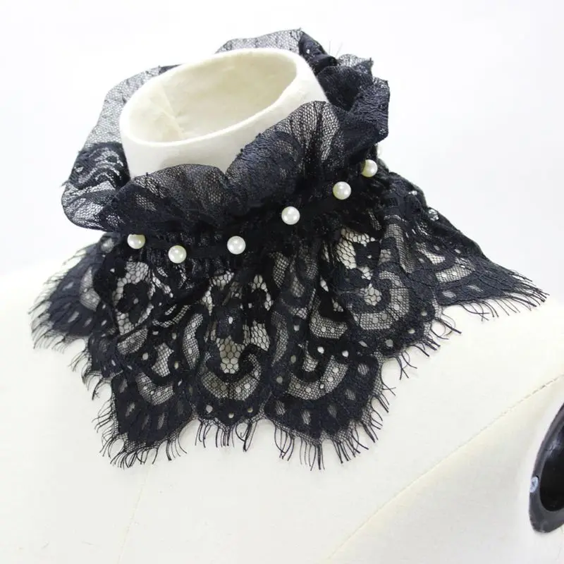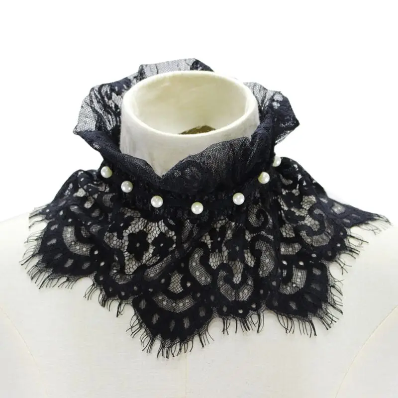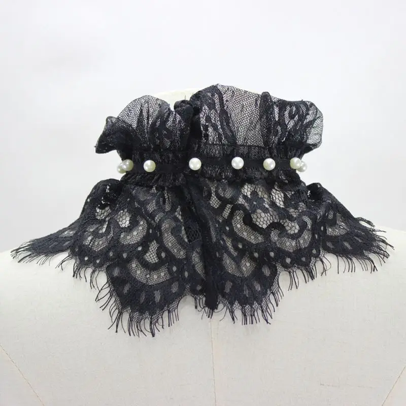 Плиссированный воротник-стойка с рюшами, ажурный кружевной дизайн, украшенный имитацией жемчуга, красивый и элегантный.