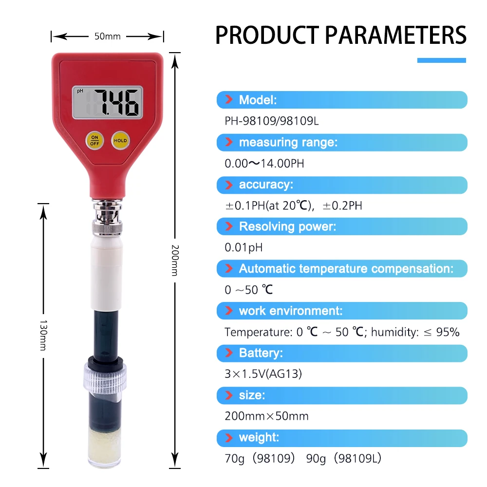Технические параметры: РН-тип 98109/98109 л Диапазон измерения: 0,00 ~ 14.00PH Точность ± 0,1ph (при 20 ℃), ± 0,2ph Разрешение 0,01 pH Автоматическая компенсации температуры 0 ℃ ~ 50 ℃ Рабочая зона: температура: 0 ℃ ~ 50 ℃; Влажность: 95 ℅ или менее Батарея 3 × 1,5 V(AG13) не прилагаются Размер 51 мм x 66 мм x 25 мм Вес: ph-98109 (70 г), ph-98109l (90 г)