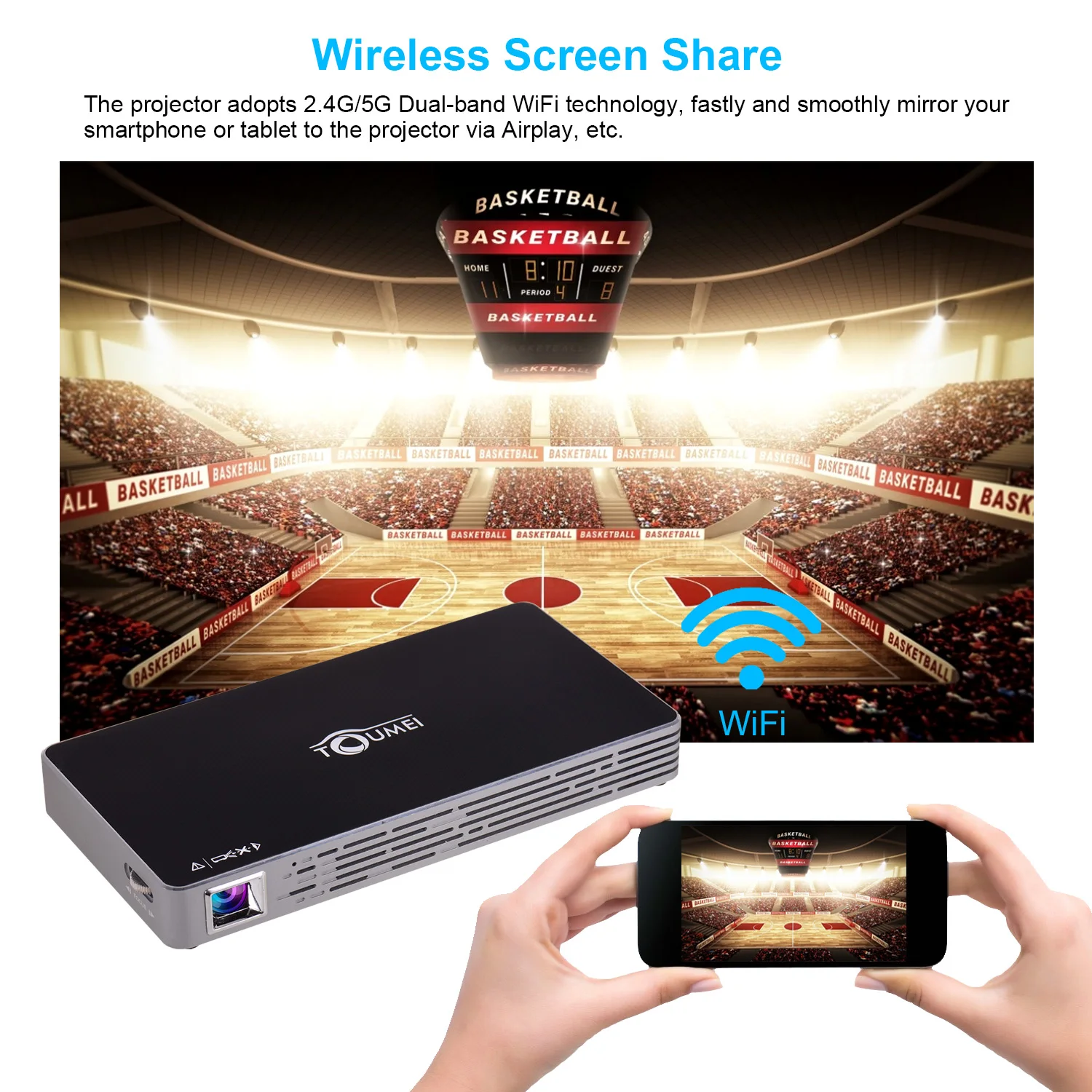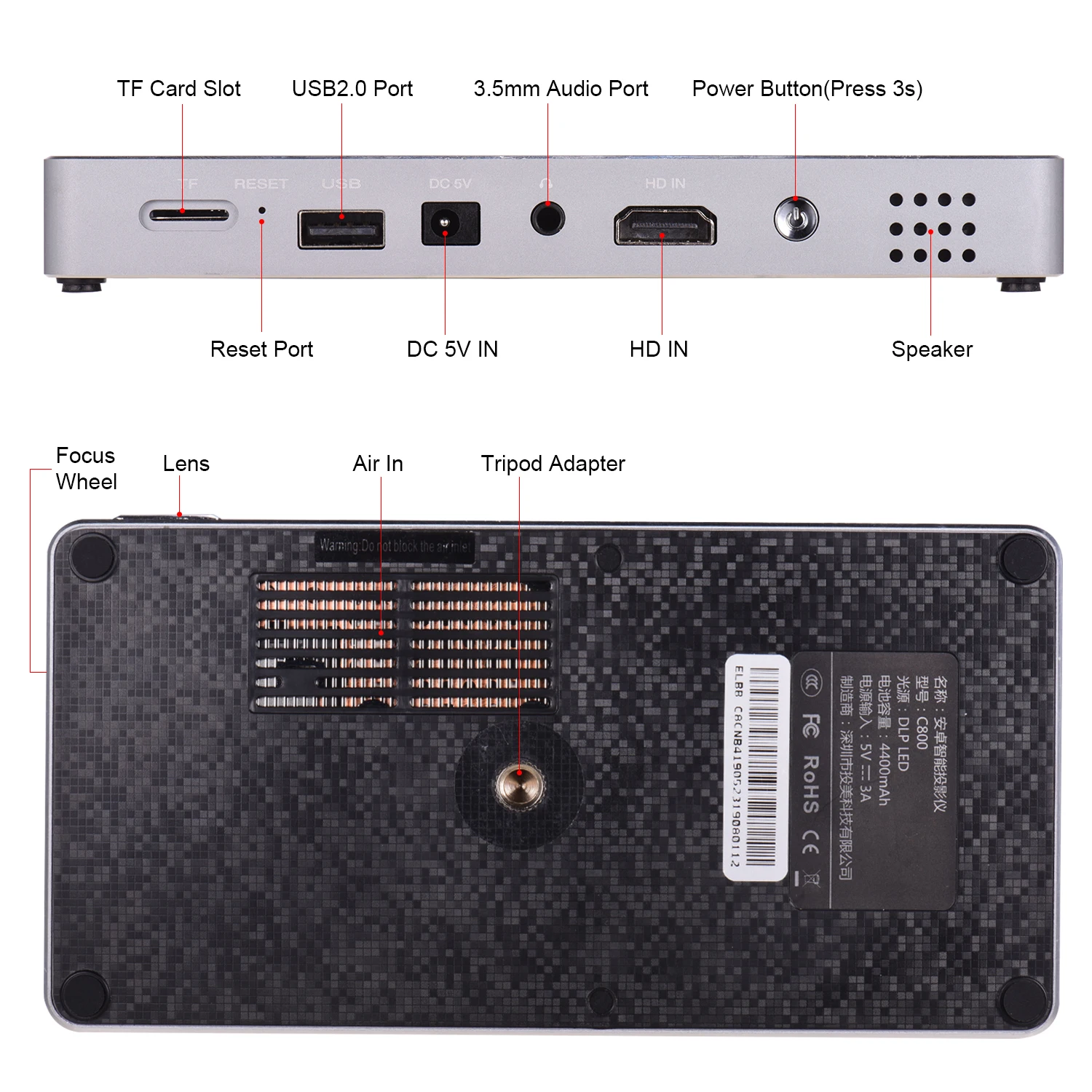 [Переносной DLP умный проектор]:Проекционная рама выполнена из алюминиевого сплава, компактного и высококачественного материала. Маленький и легкий дизайн, как домашний кинотеатр в руке. Проекционный размер 30-120 дюймов, проекционное расстояние 1-3 м, рацион 4:3/16:9/16:10, подарит вашей семье превосходный домашний кинотеатр. Подходит для использования в офисе, может читать PPT, Words, Excel.