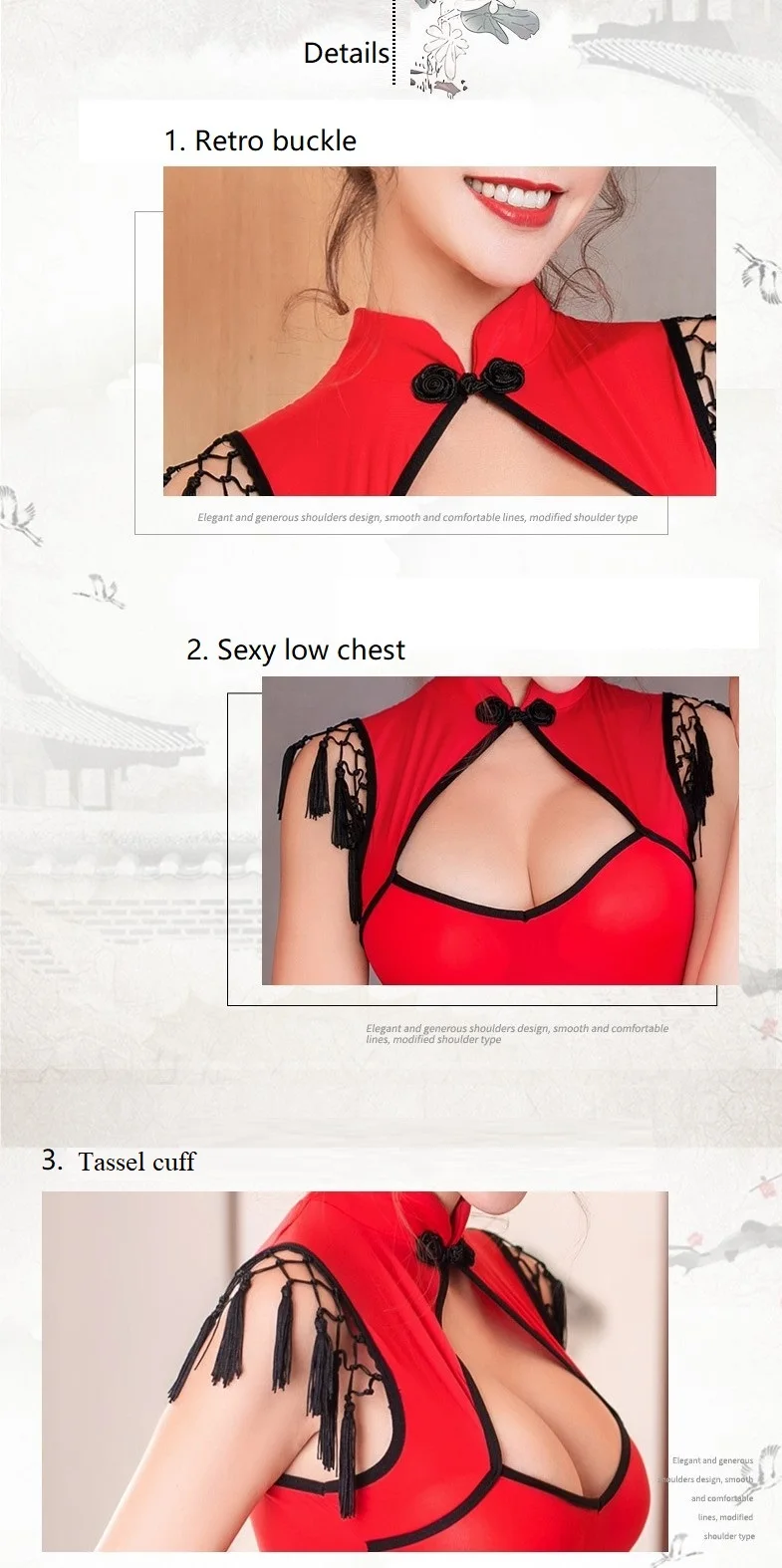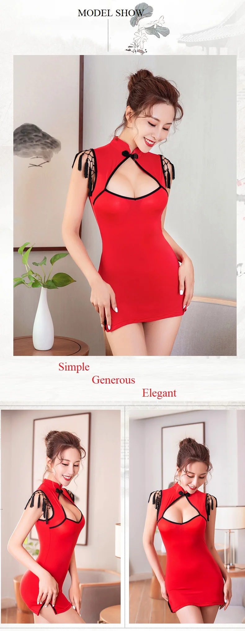 Эротическое платье, высокая эластичность, блестящая кисточка, короткое платье Ципао с вырезами, низкая грудь, высокая посадка, шелковое мини-платье из ледяного шелка, одежда для сцены