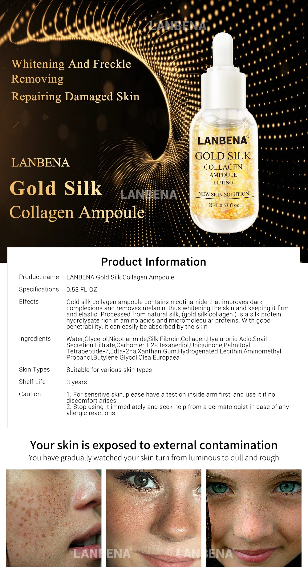 Золотой Шелковый ампула коллагена содержит никотинамид, который улучшает темные цвета лица и удаляет меланин, тем самым отбеливая кожу и сохраняя ее упругой и упругой. Обработанный из натурального шелка (золотой Шелковый коллаген)-это гидролизатор протеина шелка, богатый аминокислотами и микромолекулярными белками. С хорошей проницаемостью, он может легко впитываться кожей.