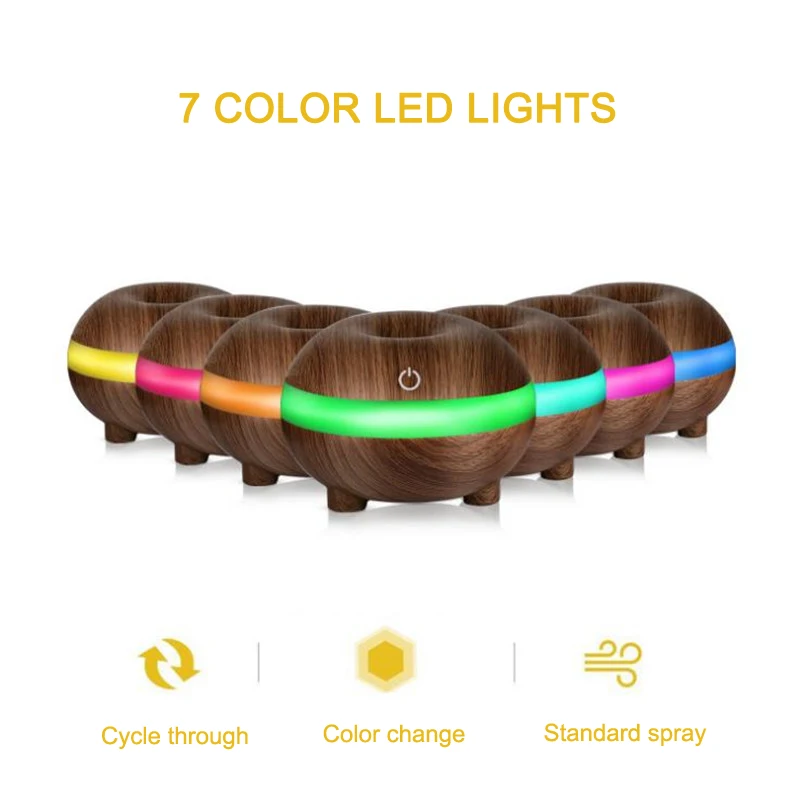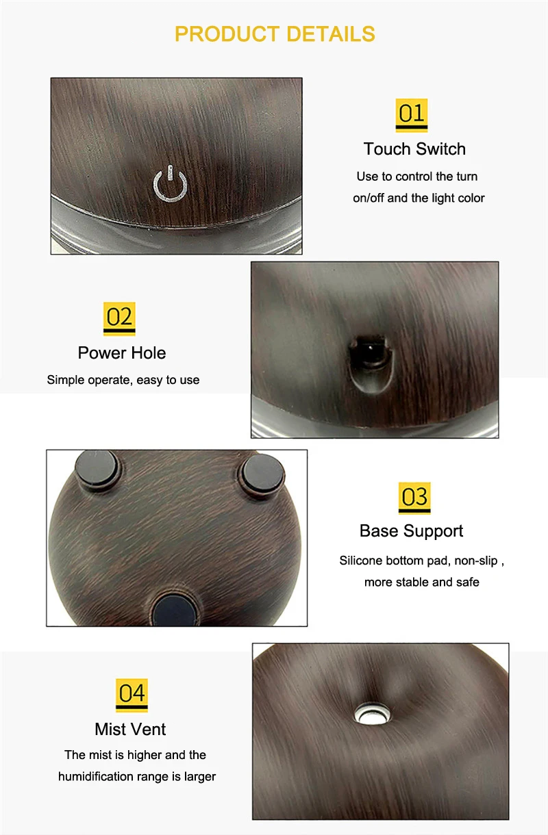 1. Древесное зерно, уникальный и компактный дизайн: Этот аромадиффузор покрыт древесным зерном, что делает его очень естественным и примитивным. Благодаря компактному и портативному дизайну крышка аромадиффузора легко снимается, вы не будете беспокоиться откручивать крышку с большой силой, когда ваши руки будут влажными. Просто аккуратно снимите крышку, добавьте воду и эфирное масло, наслаждайтесь высококачественной жизнью. 2. Портативный с регулируемым выходом тумана: диффузор эфирного масла удерживает до 300 мл воды, не слишком большой, не слишком маленький. Он производит до 35 влаги в час. Он может работать до 6 часов непрерывной работы при низком тумане. Автоматическое выключение при использовании воды, что обеспечивает безопасность. Длительное нажатие для переключения между высоким и низким туманом для продления срока запотевания. (Один звуковой сигнал для режима сильного тумана, Два звуковых сигнала для режима низкого тумана) 3,7 цветной светодиодный светильник. 7 цветов, вращающихся через/фиксированных один цвет устойчивый ВКЛ/ВЫКЛ. Каждый цвет регулируется между яркими и тусклыми. Идеальный ночной Светильник для детской спальни и мягкий светильник создает романтическую атмосферу, которая помогает вам избежать шума и суеты современной жизни. 4. Может использоваться в качестве увлажнителя. Обеспечивает влагу для сухой и сухой кожи.
