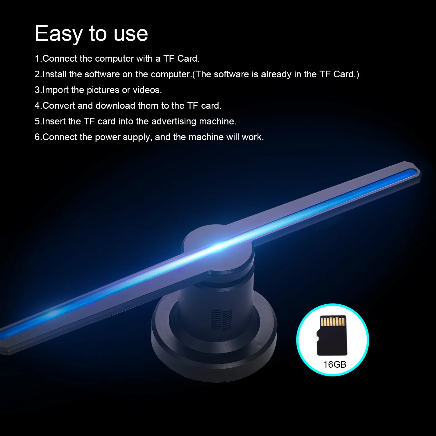 Поддержка WiFi подключения:Вставка tf-карты на машину. Пожалуйста, загрузите программное обеспечение на свой смартфон или ПК, подключите к источнику питания, голограммный проектор может подключаться к вашему устройству через Wi-Fi, конвертировать и загружать видео или изображения на рекламную машину с помощью программного обеспечения, И машина отобразит загруженное Вами содержимое. (Компьютерное программное обеспечение уже находится в tf-карте, а мобильный телефон app «3d-проигрыватель» должен быть загружен на рынок приложений/в app store.)