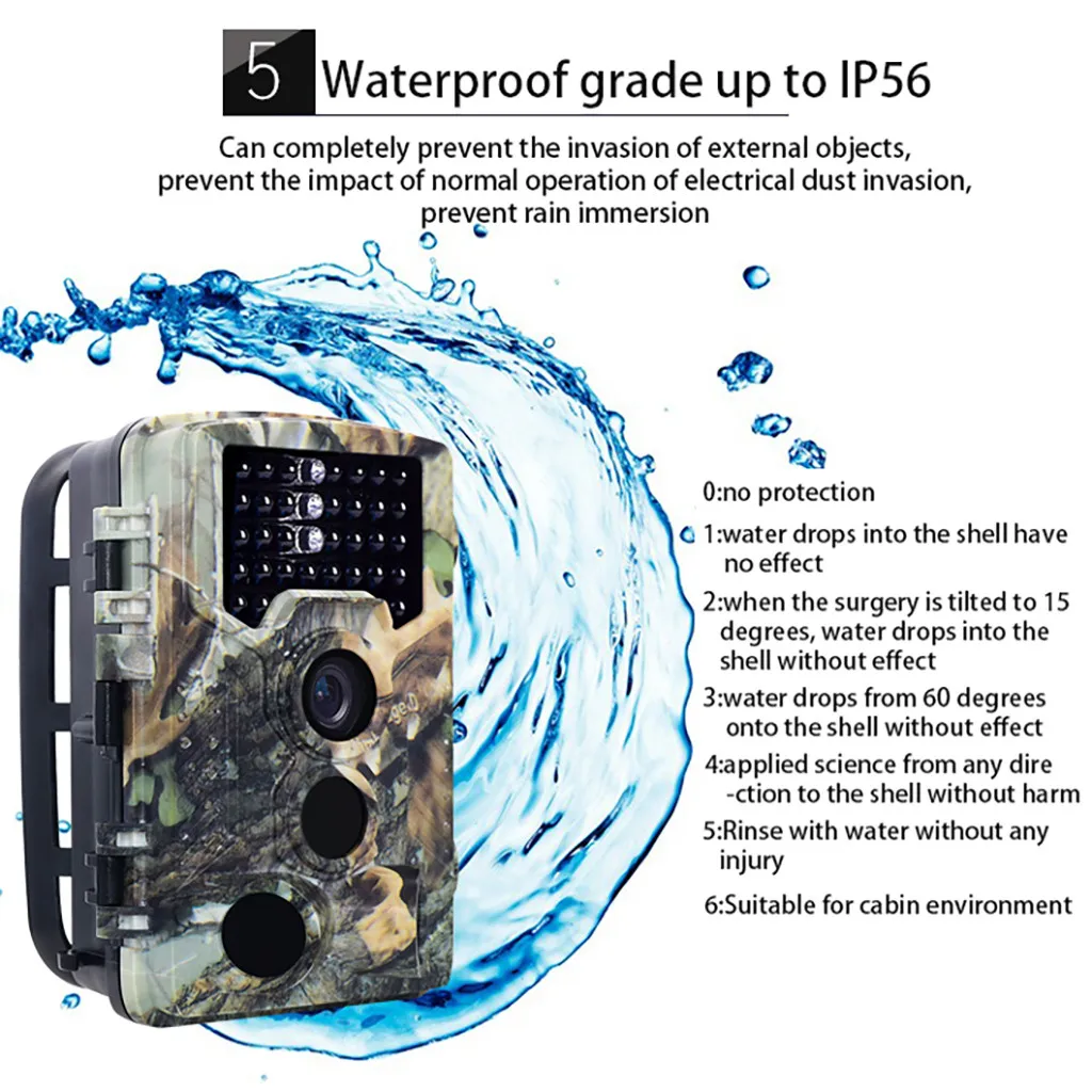 【Универсальные приложения и водонепроницаемый дизайн 】есть несколько режимов записи, которые приносят универсальные приложения в эту охотничью камеру, такие как: Интервальная запись, промежуток времени, таймер, защита паролем, штамп времени и сигнал тревоги низкого заряда батареи. Кроме того, водонепроницаемая конструкция IP66 делает камеру идеальной для наружного применения, высокая чувствительность также может сделать ее функцией камеры наблюдения.