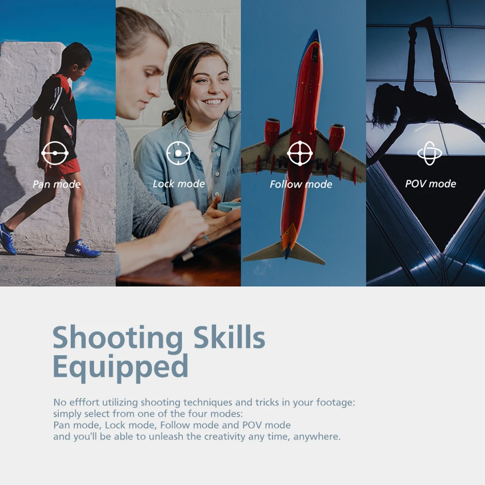Мощные функции и режимы в одном: стабилизатор имеет функции timelapse, motionlapse, hyperlapse, panorama и функции отслеживания объекта и с POV, pan следующий режим, режим блокировки и полный следующий режим, более креативно для изучения.