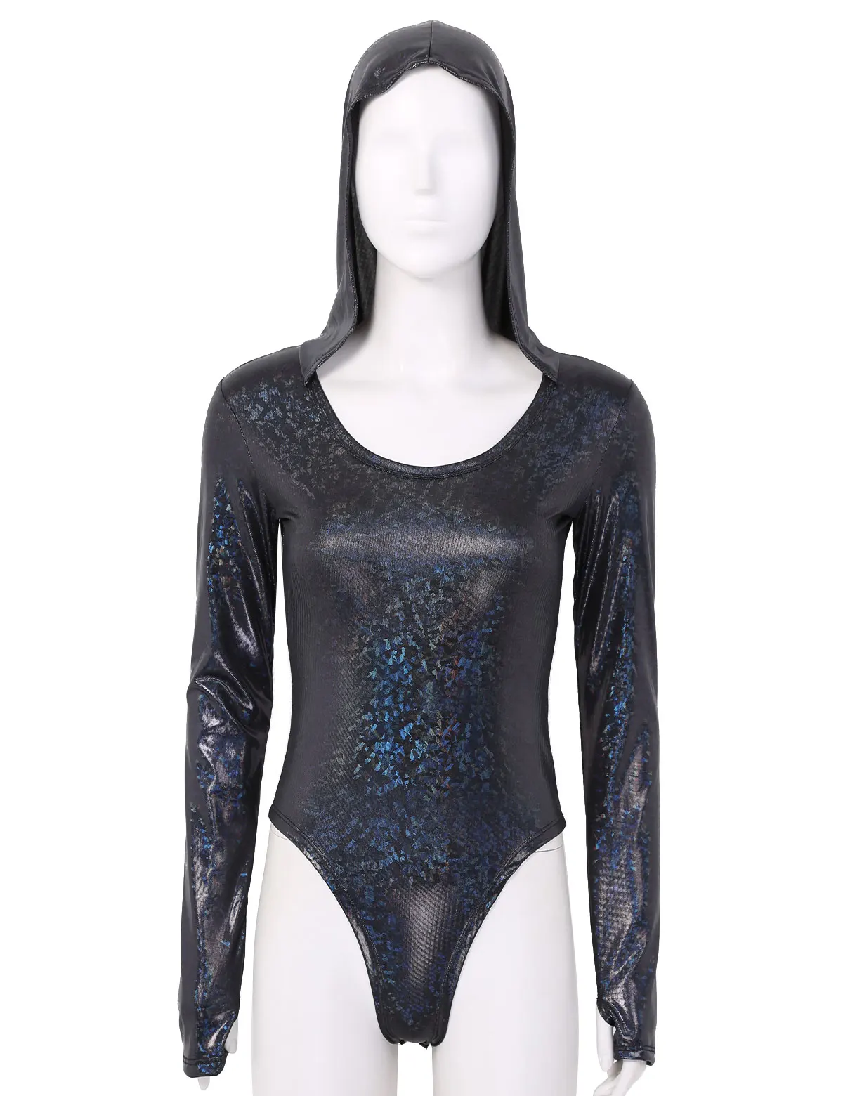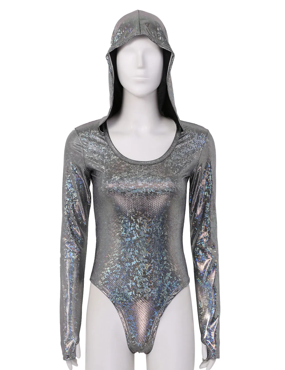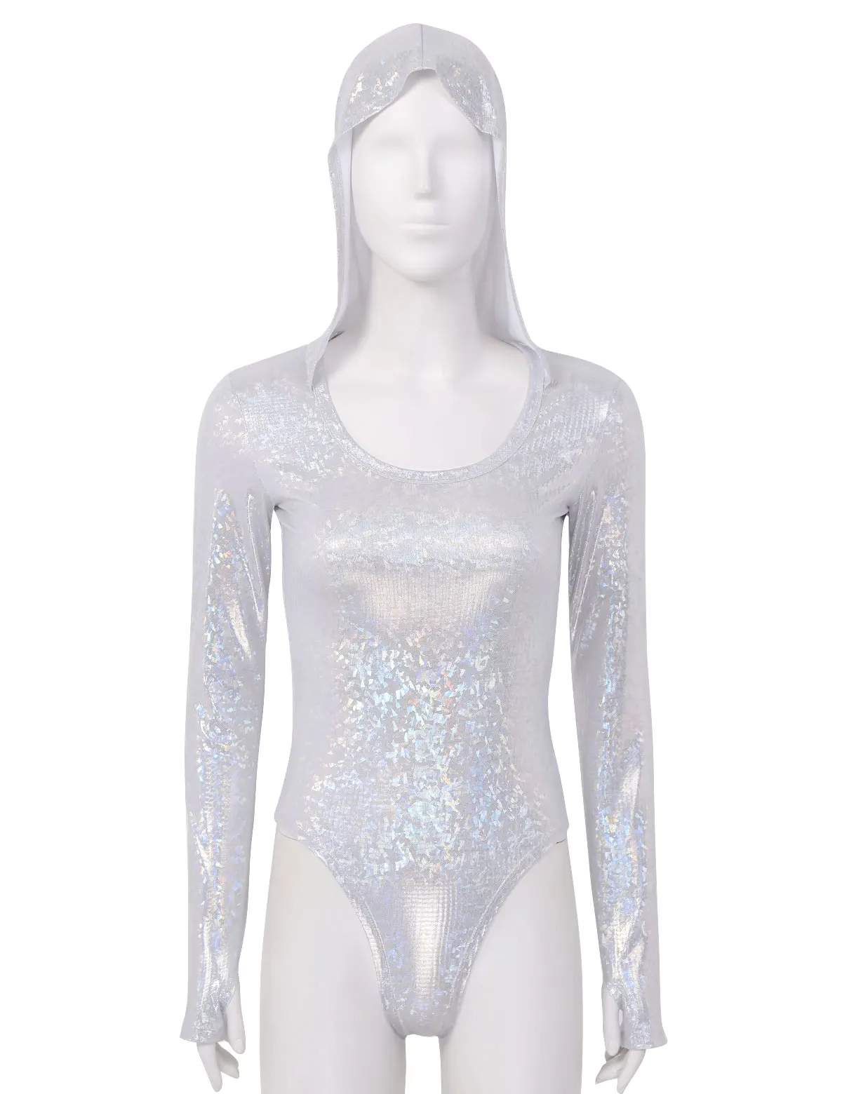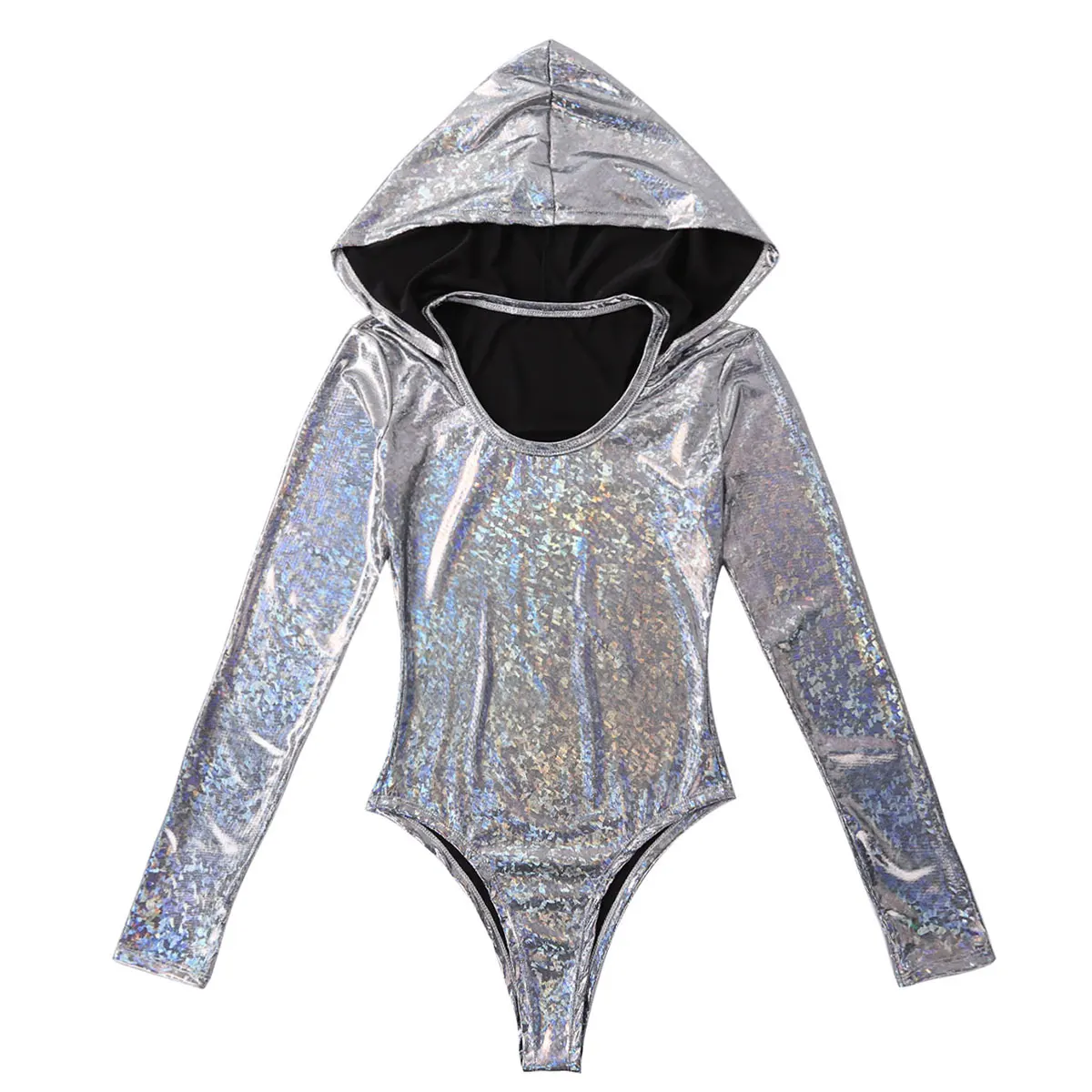 Женский цельный Блестящий металлический комбинезон с капюшоном, мерцающий и сверкающий светильник.