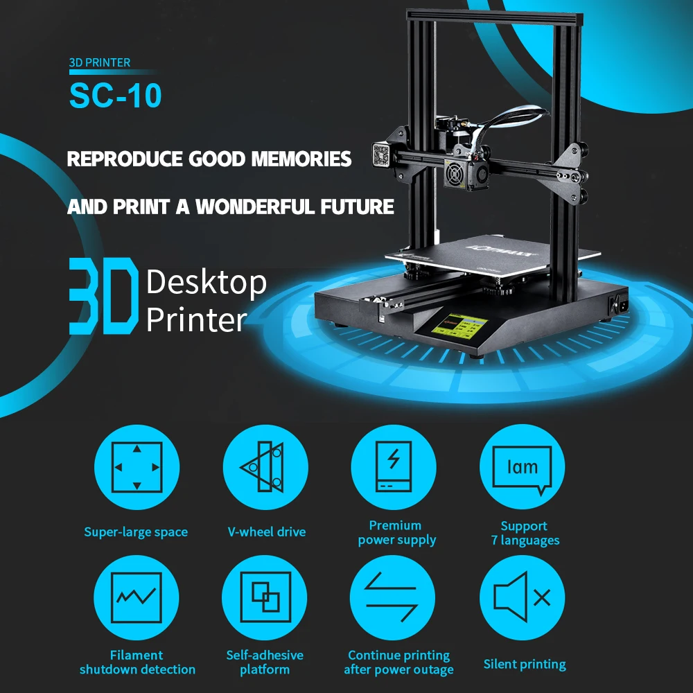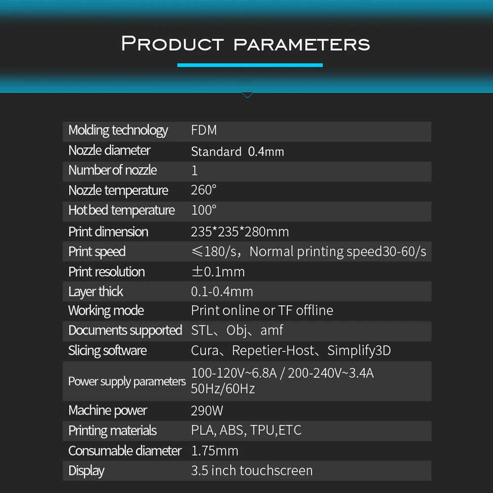 235*235*280 мм большой размер печати для того, чтобы удовлетворить различные требования для печати, поддержка различных 1,75 мм печати, такими как PLA, ABS, ТПУ, дерево, Медь-подшипник прозрачный градиентный фон и т. д. Широко используется в игрушечных, архитектурных, мебельных, образовательных, медицинских, повседневных и других областях.