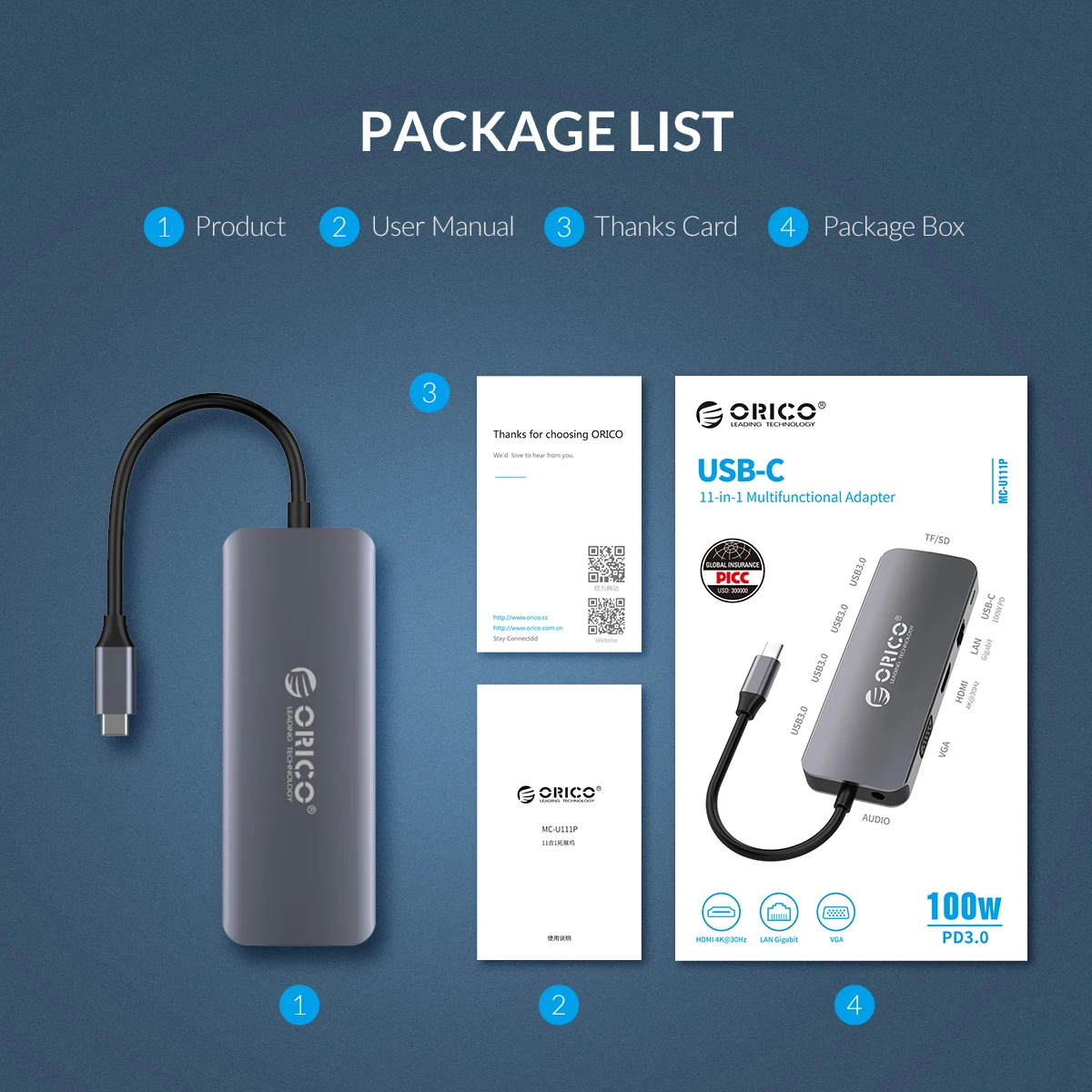 Название продукта: многофункциональная док-станция 11 в 1 Type-C Номер модели: ORICO MC-U111P Материал: Алюминий Цвет: серый Размер: 275*45*15 мм Вход: Type-C Выход: 100W PD3.0 * 1, USB3.0 * 4, TF3.0/SD3.0 * 1, VGA * 1, HDMI * 1, RJ45 * 1, 3,5 мм аудио * 1 RJ45 Порты и разъёмы: 10/100/1000 Мбит/с Разрешение HDMI: 4K при 30 Гц Разрешение VGA: 1920*1080P при 60 Гц PD мощность: PD3.0,5-20 в/5A max Скорость передачи данных через USB 3,0: до 5 Гбит/с Емкость TF/SD: 2 ТБ Max