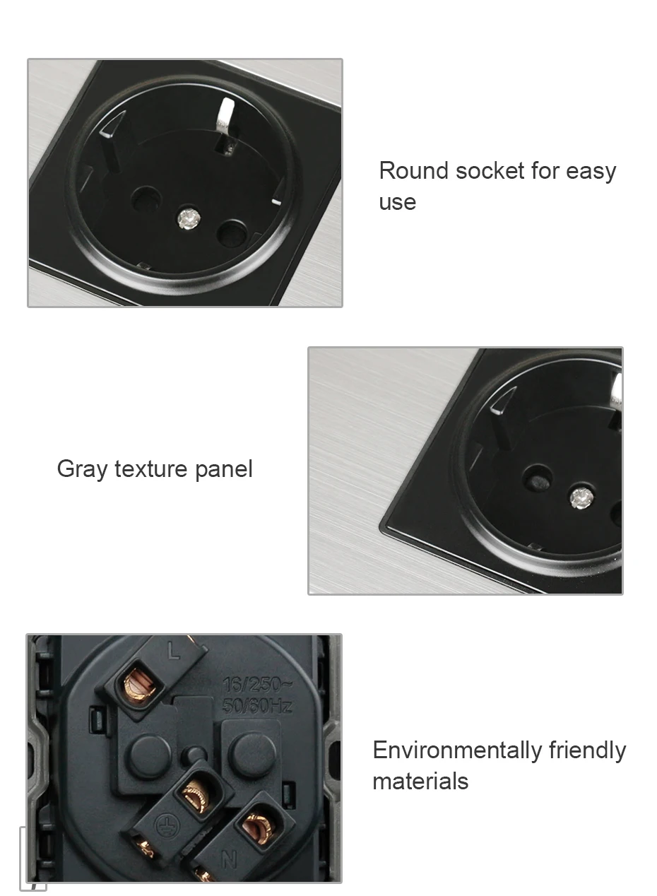 UNKAS Silver Black Child Protective Door Stainless Steel Panel 5 Gang Wall Socket 16A EU Russia Spain Electrical Outlet