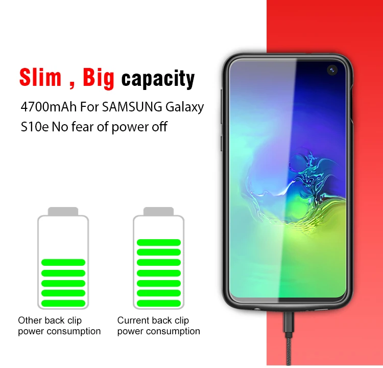 Особенности: Идеально подходит: чехол для батареи специально разработан для Samsung Galaxy S10e Встроенный аккумулятор емкостью 4700 мАч: удобный и простой в использовании, возможность зарядки в любом месте, особенно для экстренной зарядки. Светодиодный дисплей: своевременное напоминание о необходимости зарядки телефона в любом месте в любое время, безопасно для использования Зарядка и защита 2 в 1: обеспечивает емкость 4700 мА · ч с высококачественным материалом для защиты вашего телефона от царапин, грязи и других ежедневных разрывов. Интегрированная конструкция цепи: эффективно Избегайте короткого замыкания сверхурочного зарядного устройства даже в экстремальных условиях неправильной работы. С умным переключением и точным дисплеем питания, чтобы продлить срок службы встроенного аккумулятора. Примечание: Возможна небольшая разница в цвете из-за разрешения дисплея. Упаковочный лист 1 x чехол для батареи Samsung Galaxy S10e