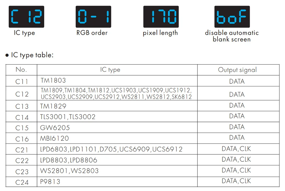 Тип IC, заказ RGB и настройка длины пикселя