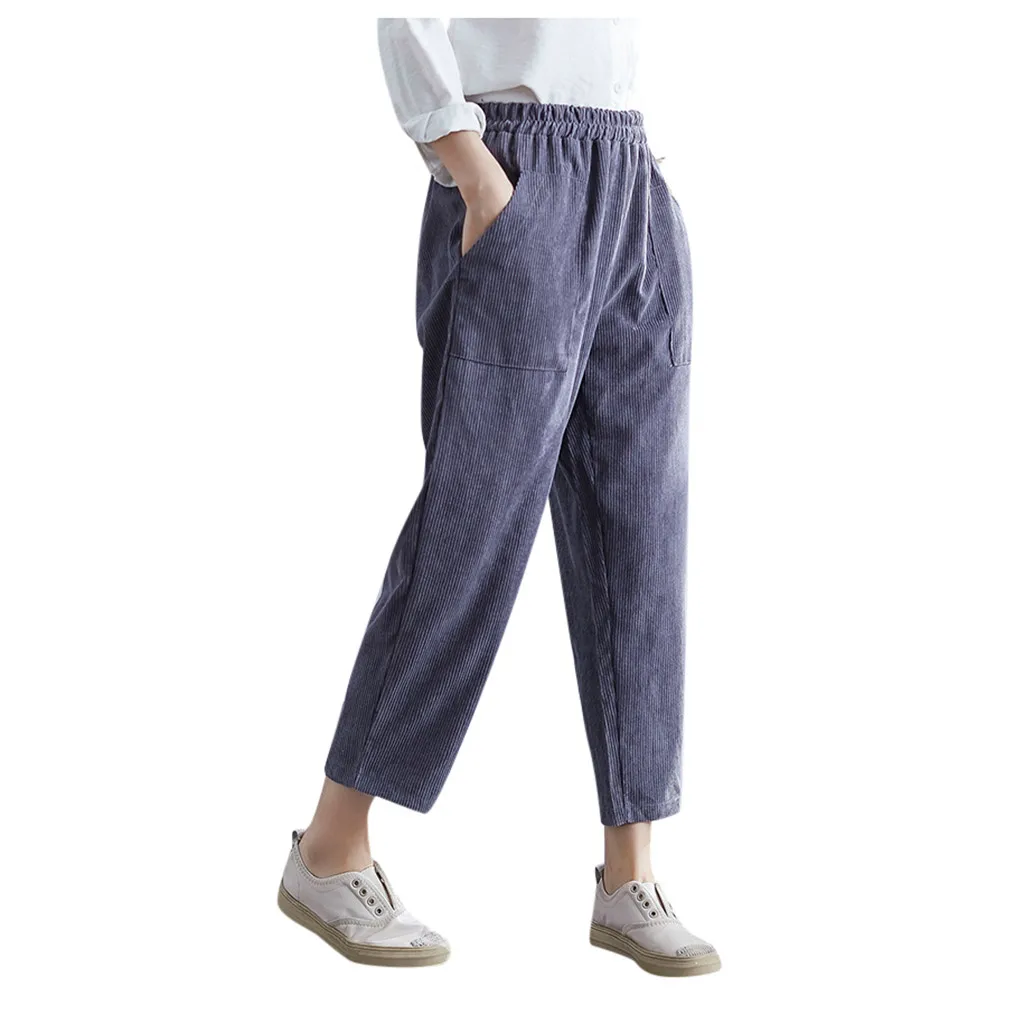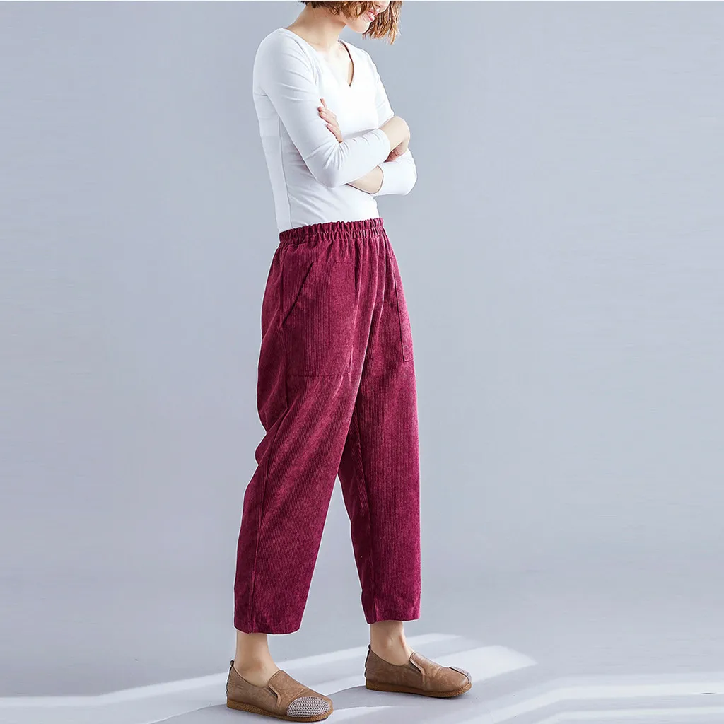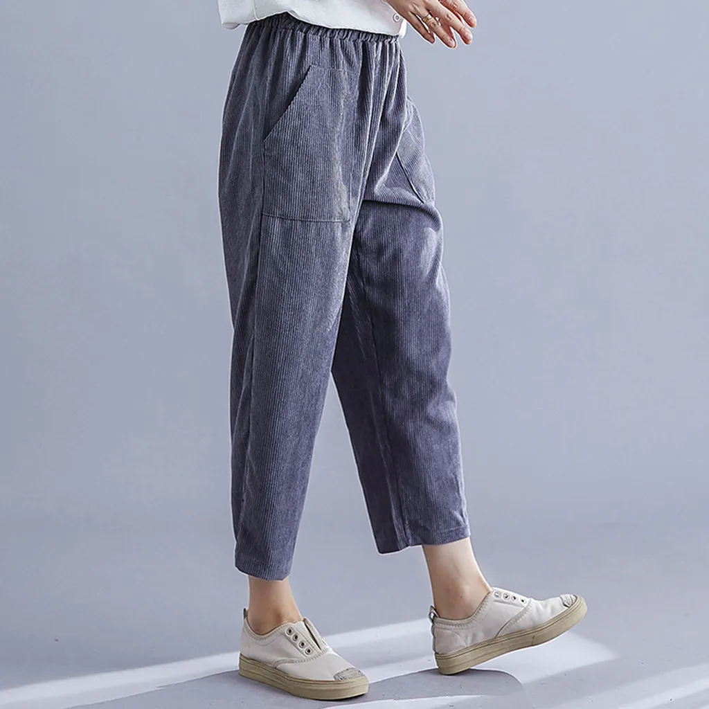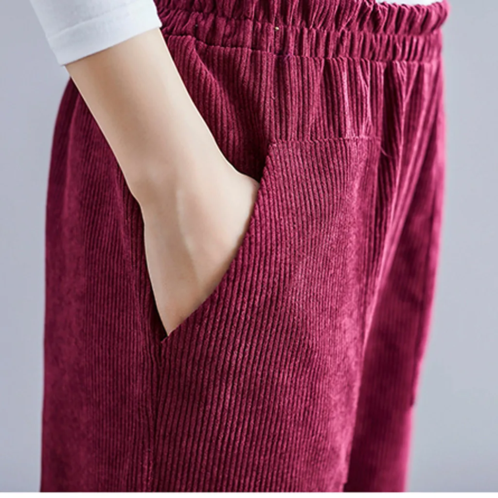Женские вельветовые укороченные брюки с эластичным поясом, повседневные брюки с карманами, брюки-слаксы, Осень-зима 2020