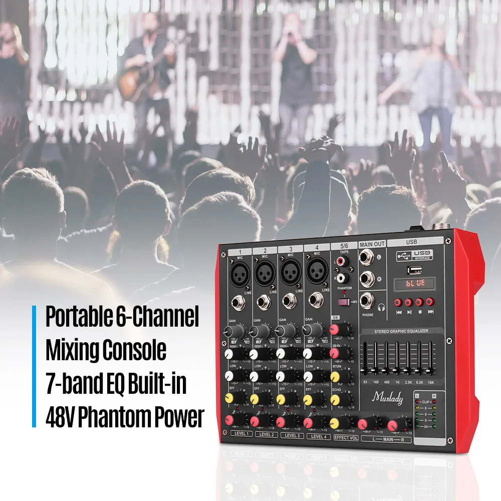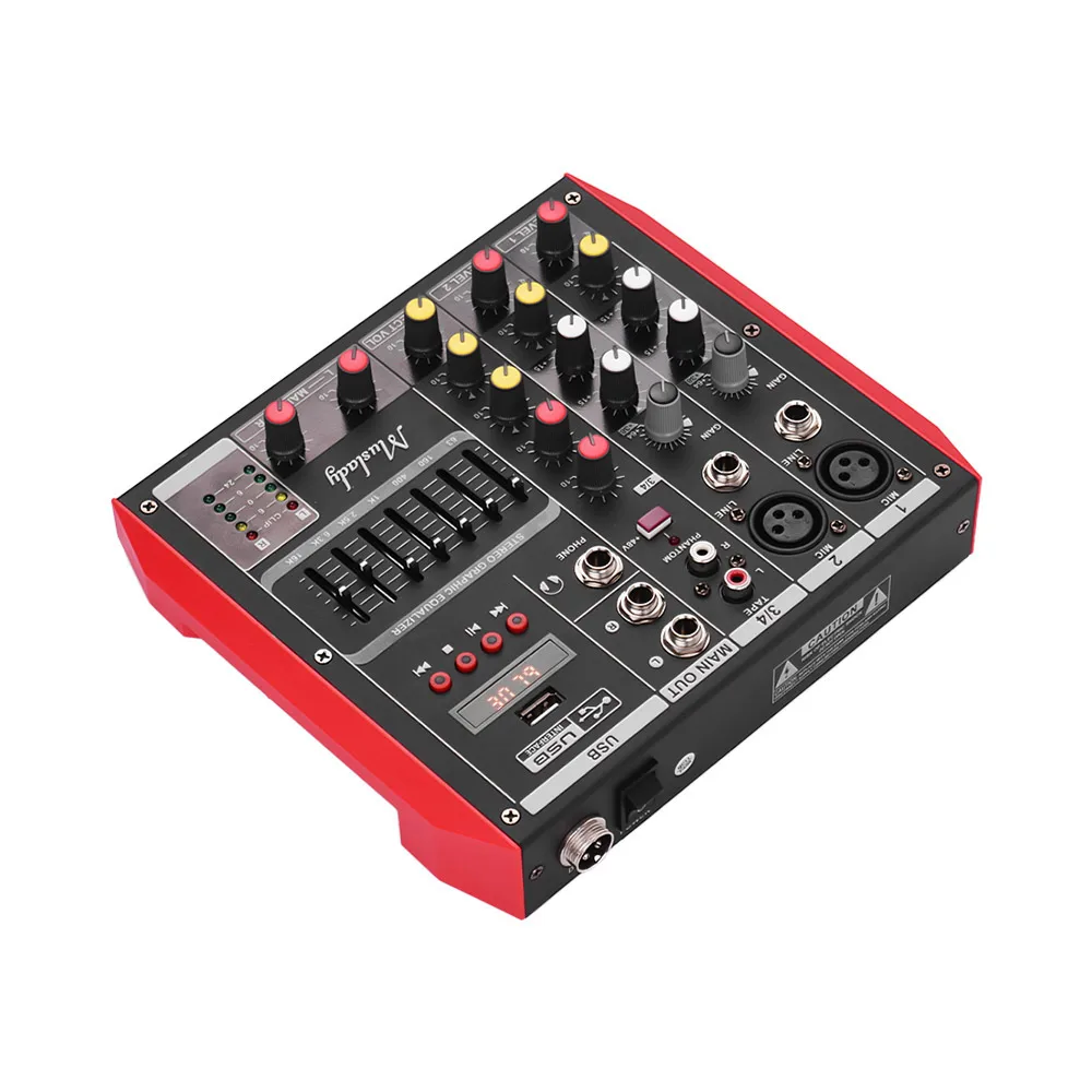 Поддерживает подключение BT и функции mp3-плеера USB, вы можете воспроизводить сопутствующую музыку через смартфон или MP3 или usb-диск; 7-полосный эквалайзер регулирует Звук сигнала, отправляемого на основные разъемы; встроенный 48В фантомная мощность для конденсаторного микрофона
