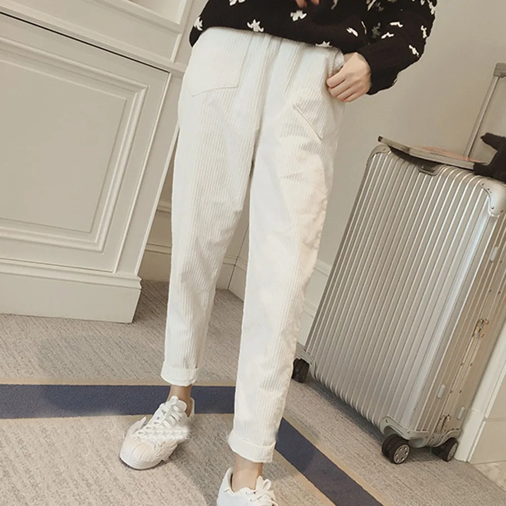 Узкие брюки с высокой талией 2020 вельветовые Модные повседневные свободные брюки с эластичным поясом и карманами для девочек
